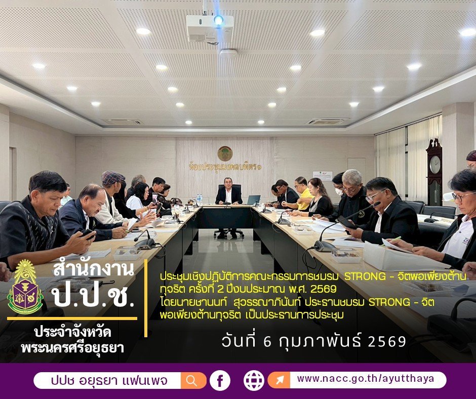 🗓 วันที่ 6 กุมภาพันธ์ 2569 นายชานนท์ สุวรรณาภินันท์ ประธานชมรม STRONG – จิตพอเพียงต้านทุจริต เป็นประธานการประชุมเชิงปฏิบัติการคณะกรรมการชมรม STRONG – จิตพอเพียงต้านทุจริต ครั้งที่ 2 ปีงบประมาณ พ.ศ. 2569 ณ ห้องประชุมมงคลบพิตร 1 ศาลากลางจังหวัดพระนครศรีอยุธยา