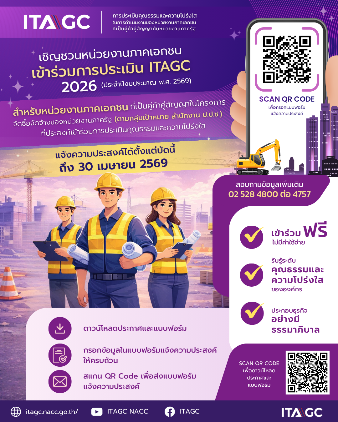 สำนักงานป.ป.ช. โดยสำนักประเมินคุณธรรม ความโปร่งใส และส่งเสริมธรรมาภิบาล เดินหน้าขับเคลื่อนการประเมินคุณธรรมและความโปร่งใสในการดำเนินงานของหน่วยงานภาคเอกชนที่เป็นคู่ค้าคู่สัญญากับหน่วยงานภาครัฐ (Integrity and Transparency Assessment of Government Contractors: ITAGC) เพื่อยกระดับมาตรฐานการดำเนินธุรกิจให้โปร่งใส มีธรรมาภิบาล และตรวจสอบได้ พร้อมเชิญชวนภาคเอกชน ที่เป็นคู่ค้าหรือคู่สัญญากับหน่วยงานภาครัฐ เข้าร่วมรับการประเมิน โดยสามารถติดตามข้อมูลและหลักเกณฑ์การประเมินได้ที่เว็บไซต์ https://itagc.nacc.go.th/ ได้ตั้งแต่บัดนี้ จนถึงวันที่ 30 เมษายน 2569