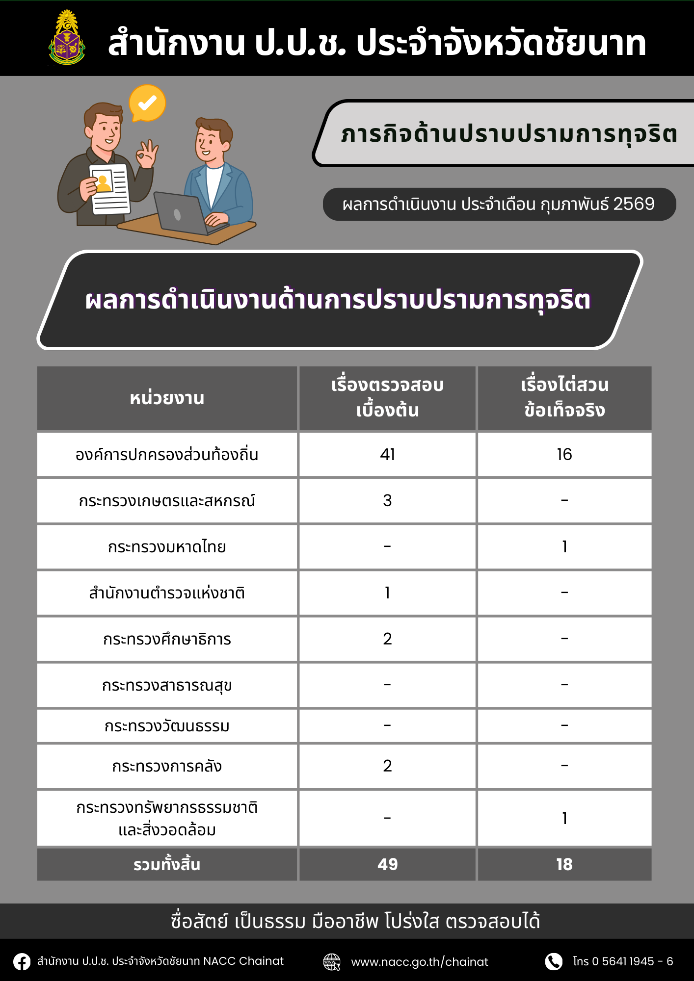 สำนักงาน ป.ป.ช. ประจำจังหวัดชัยนาท แถลงสรุปผลการดำเนินงานเดือนกุมภาพันธ์ 2569