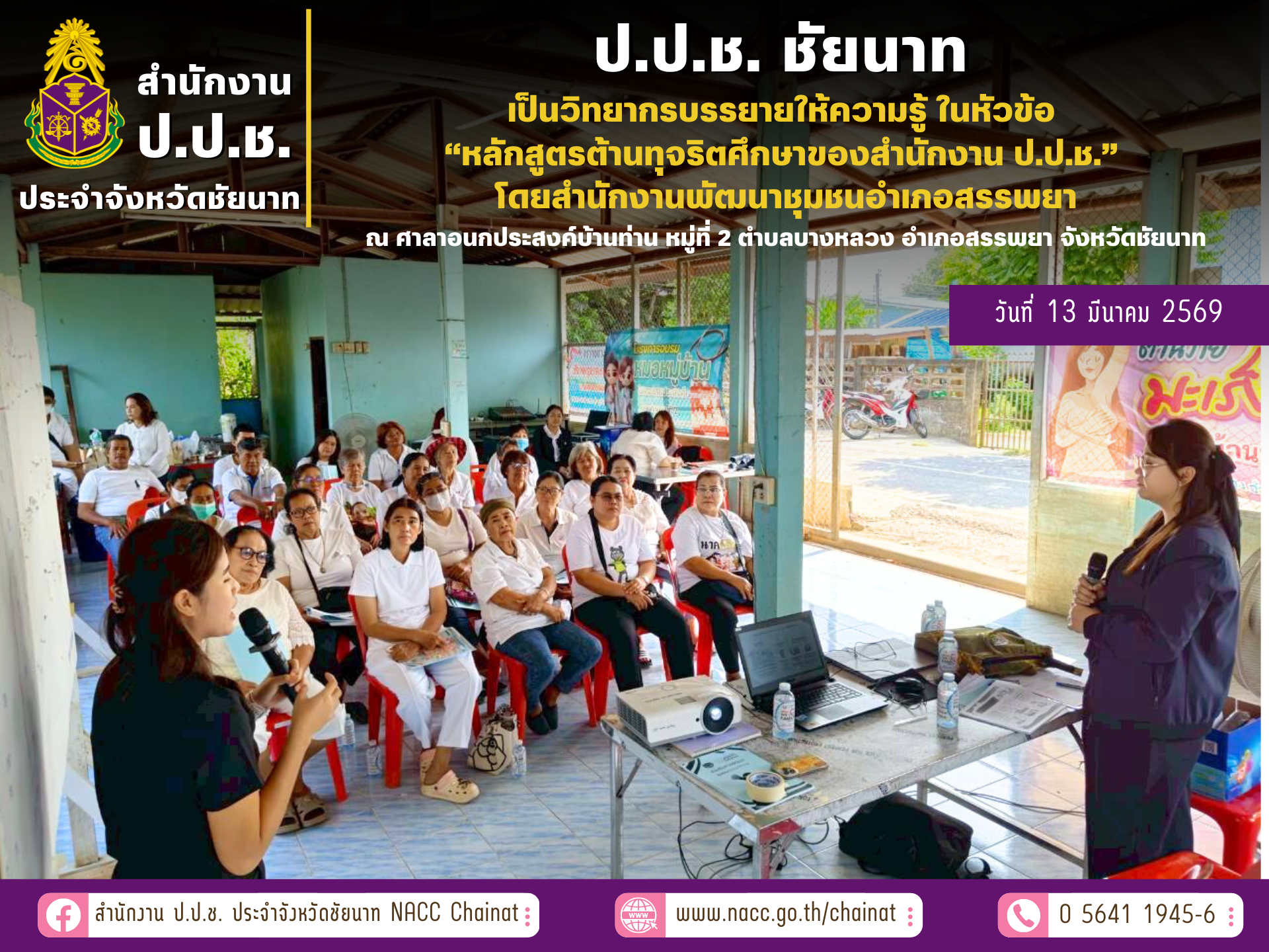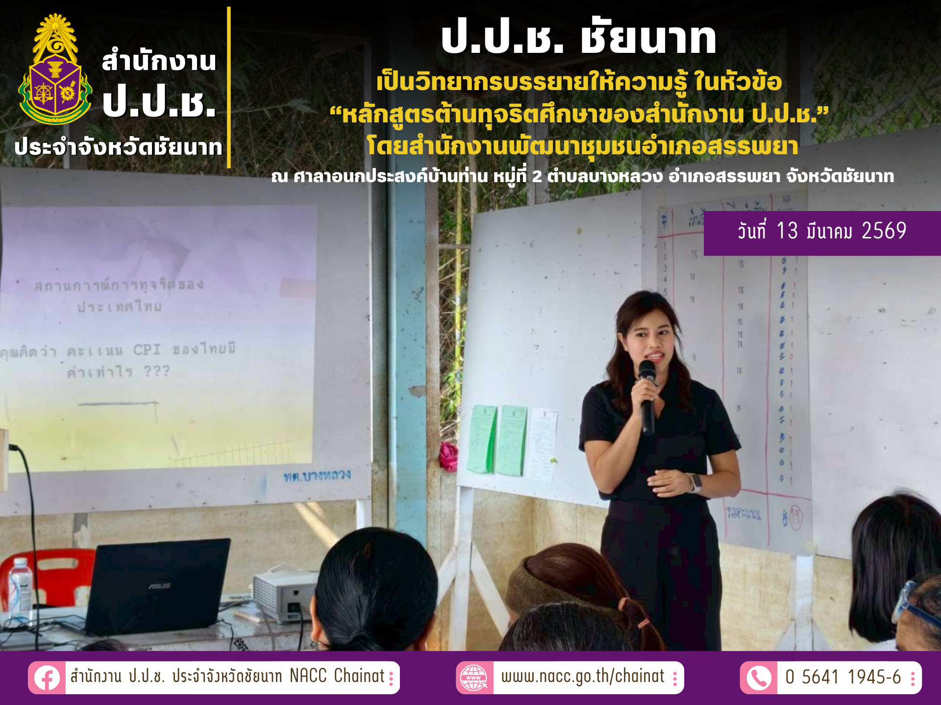 เมื่อวันที่ 16 มีนาคม 2569 ผู้อำนวยการสำนักงาน ป.ป.ช. ประจำจังหวัดชัยนาท มอบหมายให้เจ้าหน้าที่กลุ่มงานป้องกันการทุจริตเป็นวิทยากรให้ความรู้ใน โครงการส่งเสริมพัฒนาชุมชนธรรมาภิบาล สำนักงานพัฒนาชุมชนอำเภอสรรคบุรี โดยบรรยายให้ความรู้ในหัวข้อ หลักสูตรต้า...