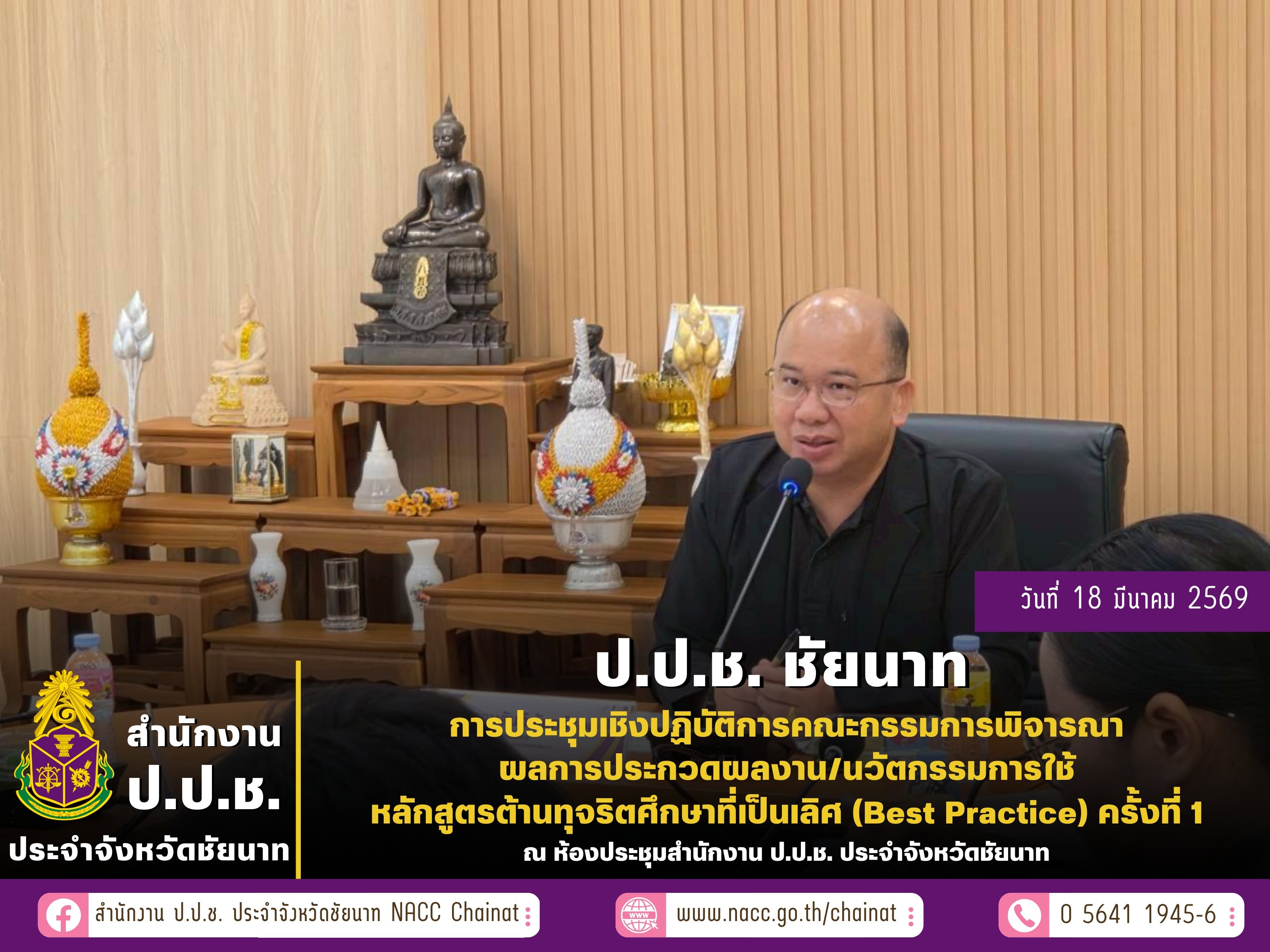 ทั้งนี้ การจัดกิจกรรม เพื่อชี้แจงที่มาเเละหลักเกณฑ์ของการประกวดผลงาน/นวัตกรรมการใช้หลักสูตรต้านทุจริตศึกษาที่เป็นเลิศ (Best Practice) ให้เเก่คณะทำงานพิจารณาผลการประกวดผลงาน/นวัตกรรมการใช้หลักสูตรต้านทุจริตศึกษาที่เป็นเลิศ (Best Practice) ระดับจังหวัดชัยนาท