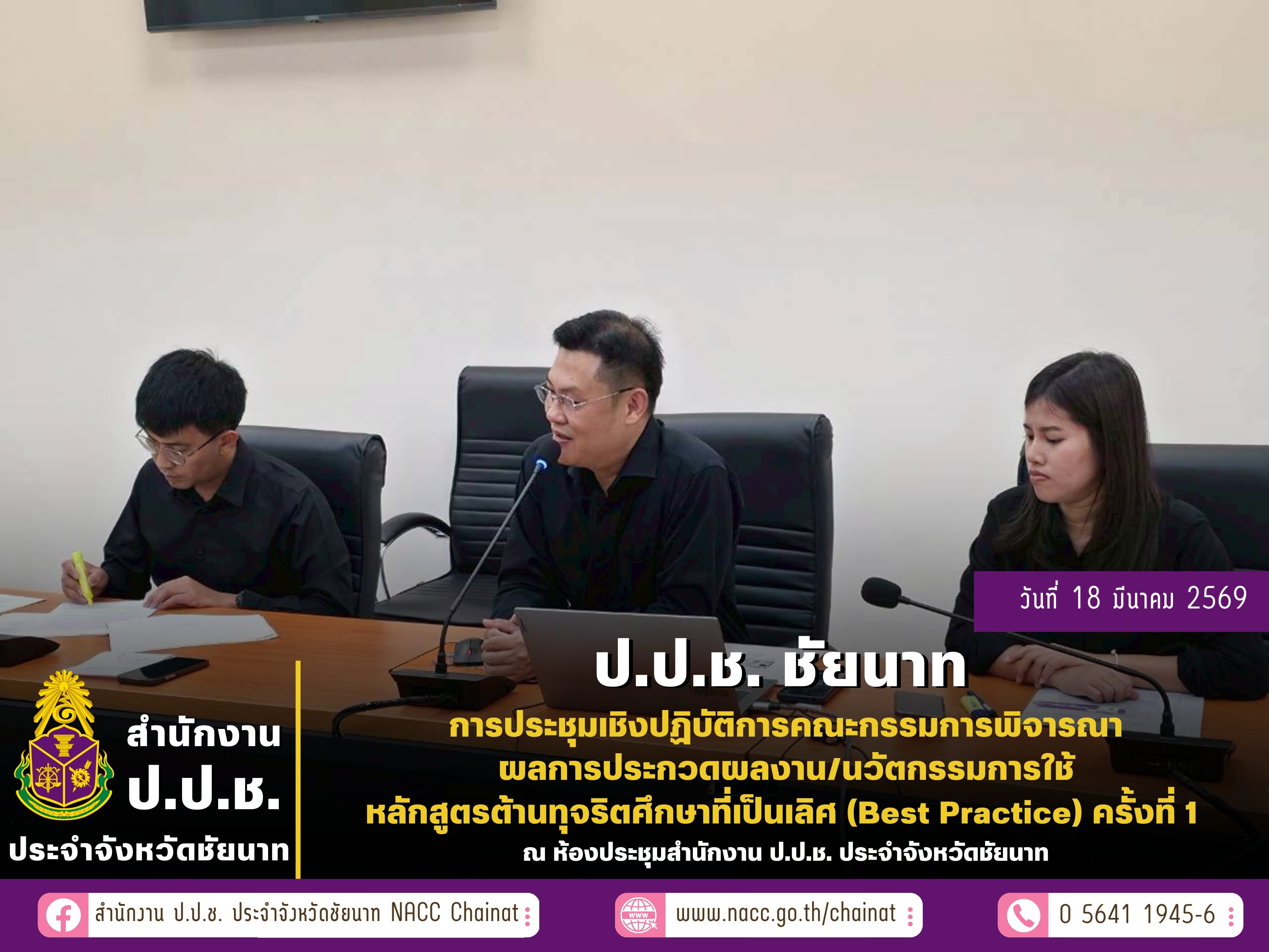 นายคมสันต์ จันทร์รอด ผู้อำนวยการสำนักงาน ป.ป.ช. ประจำจังหวัดชัยนาท พร้อมด้วยเจ้าหน้าที่กลุ่มงานป้องกันการทุจริต ดำเนินโครงการพัฒนาและขับเคลื่อนหลักสูตรต้านทุจริตศึกษา กิจกรรมการประชุมเชิงปฏิบัติการคณะกรรมการพิจารณาผลการประกวดผลงาน/นวัตกรรมการใช้หลักสูตรต้านทุจริตศึกษาที่เป็นเลิศ (Best Practice) ครั้งที่ 1 ณ ห้องประชุมชั้น 3 สำนักงาน ป.ป.ช. ประจำจังหวัดชัยนาท อำเภอเมืองชัยนาท จังหวัดชัยนาท