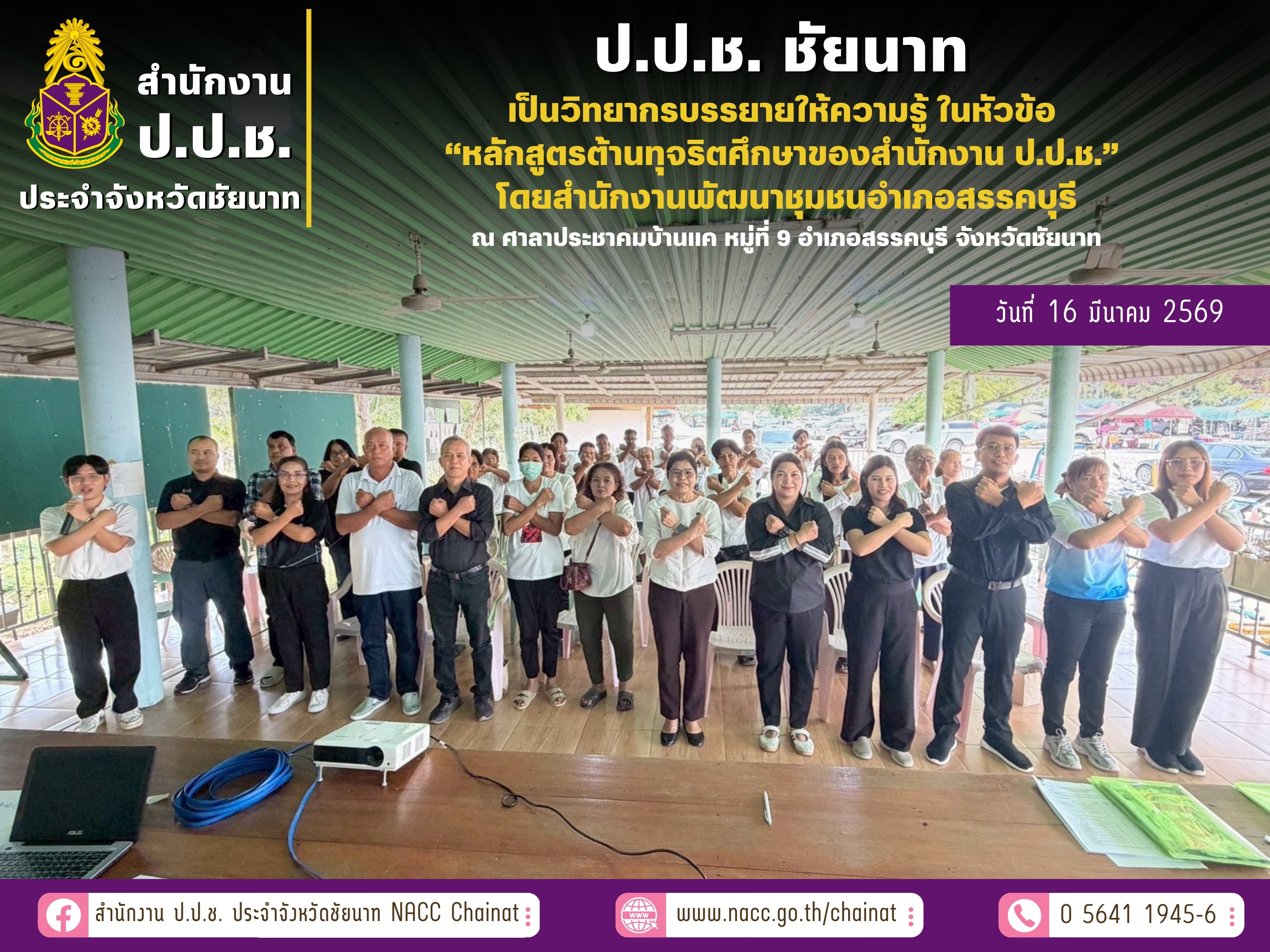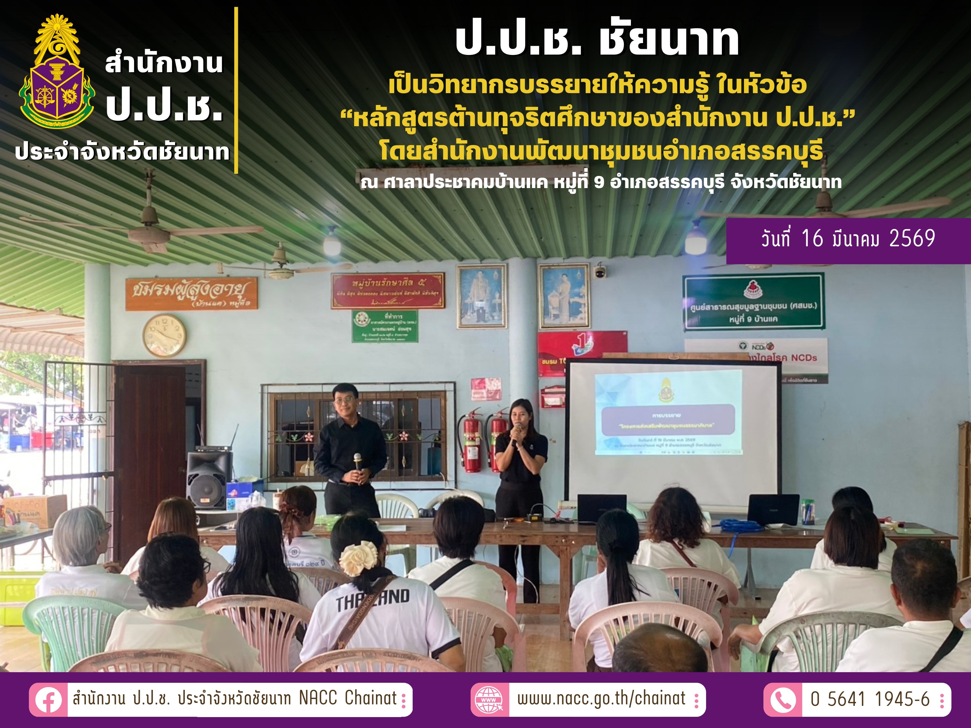 ผู้อำนวยการสำนักงาน ป.ป.ช. ประจำจังหวัดชัยนาท มอบหมายให้เจ้าหน้าที่กลุ่มงานป้องกันการทุจริตเป็นวิทยากรให้ความรู้ใน โครงการส่งเสริมพัฒนาชุมชนธรรมาภิบาล สำนักงานพัฒนาชุมชนอำเภอสรรคบุรี โดยบรรยายให้ความรู้ในหัวข้อ หลักสูตรต้านทุจริตศึกษาและหลักสูตรส่งเสริมการมีส่วนร่วมของผู้แทนภาคประชาชนในการต่อต้านการทุจริตและประพฤติมิชอบ ตามหลักสูตรต้านทุจริตศึกษาของสำนักงาน ป.ป.ช. ณ ศาลาประชาคมบ้านแค หมู่ที่ 9 อำเภอสรรคบุรี จังหวัดชัยนาท