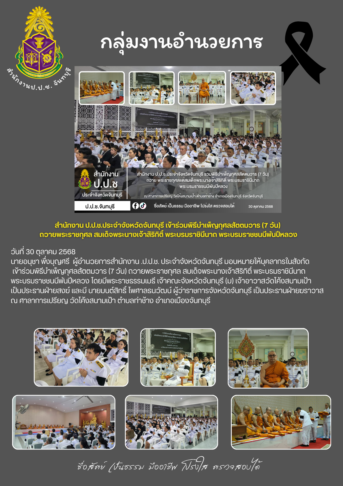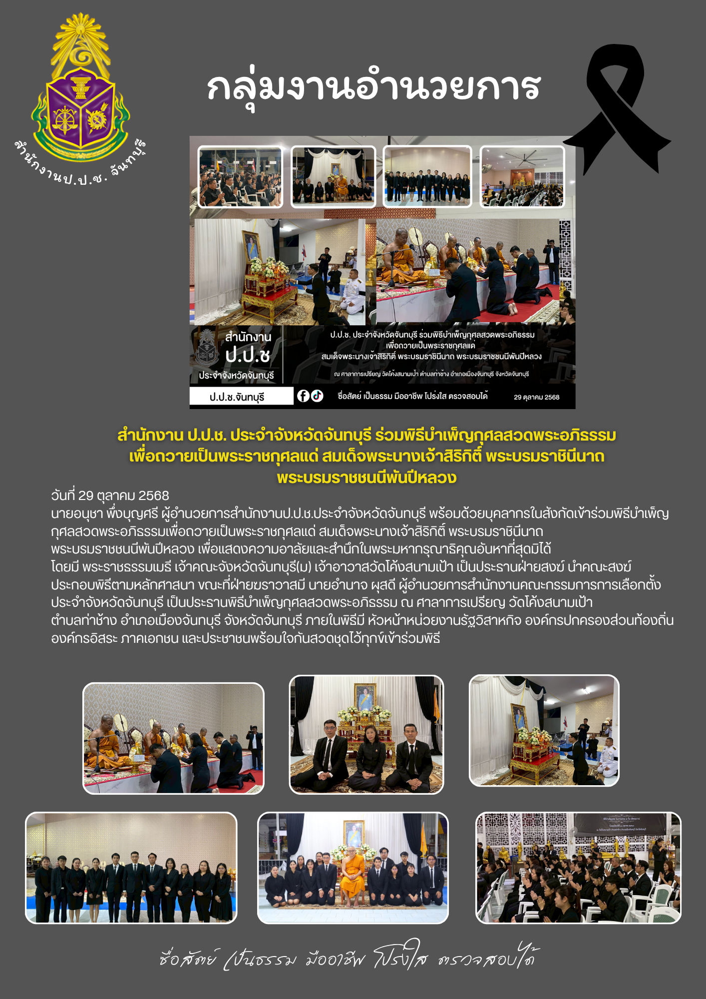 สำนักงาน ป.ป.ช. ประจำจังหวัดจันทบุรี ขอประชาสัมพันธ์ผลการดำเนินงานประจำเดือนตุลาคม 2568