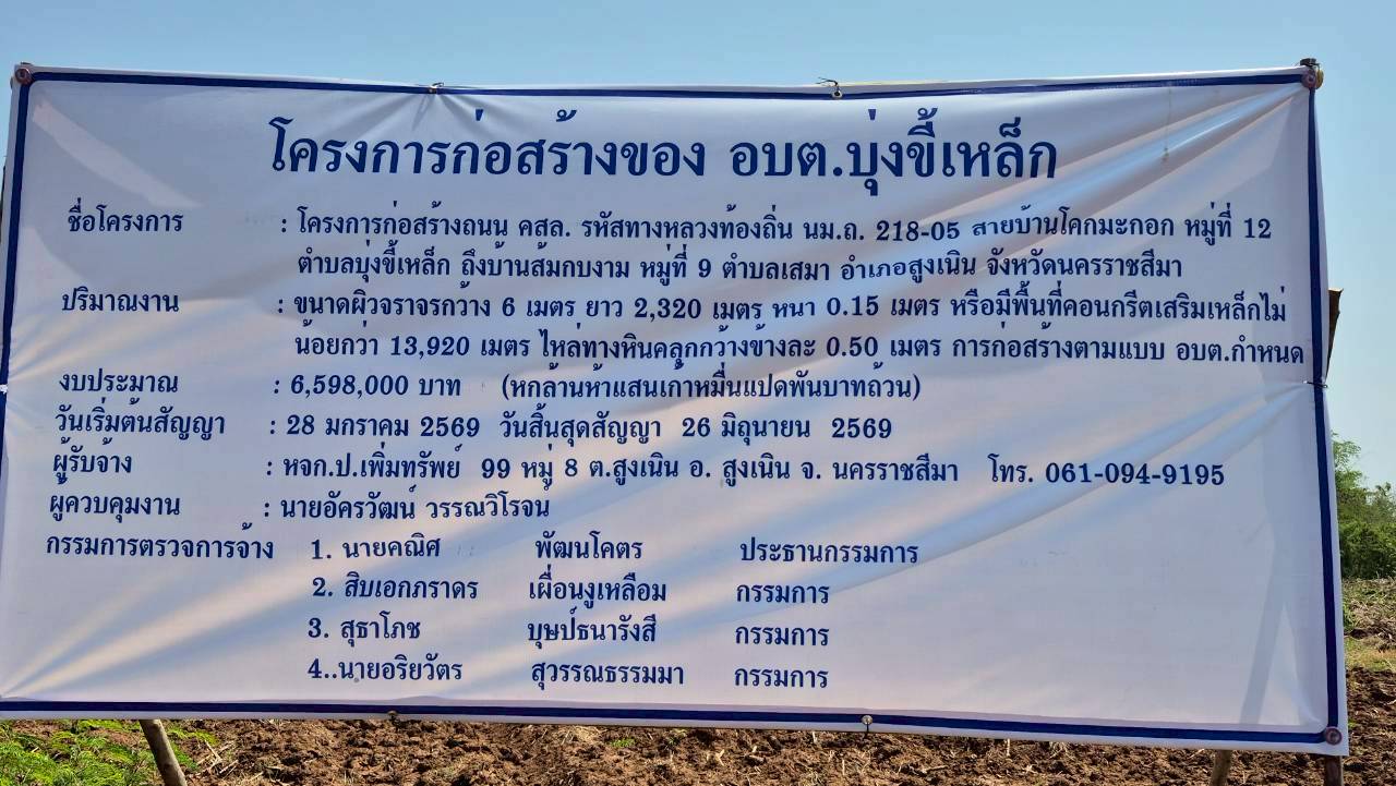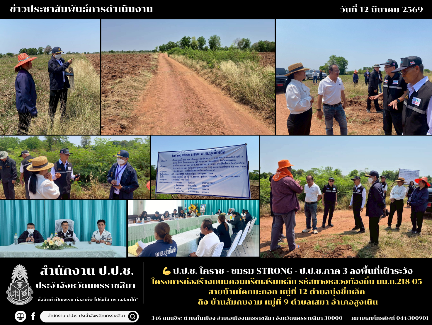 วันที่ 12 มีนาคม 2569 ผู้อำนวยการสำนักงาน ป.ป.ช. ประจำจังหวัดนครราชสีมา มอบหมายเจ้าหน้าที่กลุ่มงานป้องกันการทุจริตร่วมกับเจ้าหน้าที่งานสืบสวนคดีทุจริต ลงพื้นที่เฝ้าระวัง สังเกตการณ์ โครงการก่อสร้างถนนคอนกรีตเสริมเหล็ก รหัสทางหลวงท้องถิ่น นม.ถ.218-05 สายบ้านโคกมะกอก หมู่ที่ 12 ตำบลบุ่งขี้เหล็ก ถึง บ้านส้มกบงาม หมู่ที่ 9 ตำบลเสมา อำเภอสูงเนิน จังหวัดนครราชสีมา ร่วมกับกลุ่มประสานการป้องกันการทุจริต สำนักงาน ป.ป.ช. ภาค 3 โดยมีสมาชิกชมรม STRONG – จิตพอเพียงต้านทุจริต จังหวัดนครราชสีมา และอำเภอสูงเนิน ร่วมลงพื้นที่ ทั้งนี้เพื่อให้ภาคประชาชนเข้ามามีส่วนร่วมในการตรวจสอบการใช้จ่ายงบประมาณของหน่วยงานภาครัฐ ภายใต้แผนงานโครงการเสริมพลัง STRONG ประชาชนถอนหมุดพื้นที่เสี่ยงทุจริต (Empowering STRONG for Proactive Anti - Corruption : ESPAC)