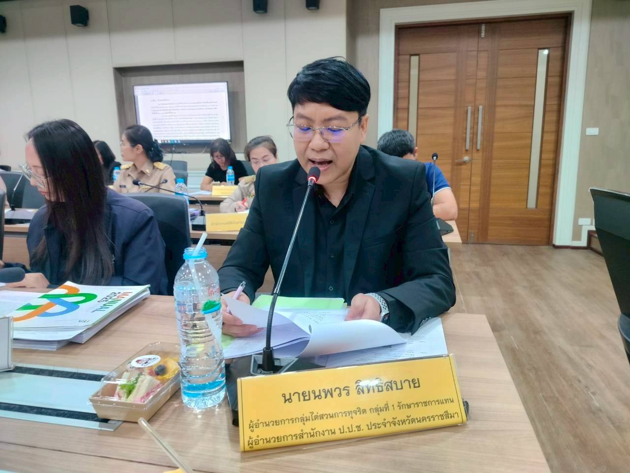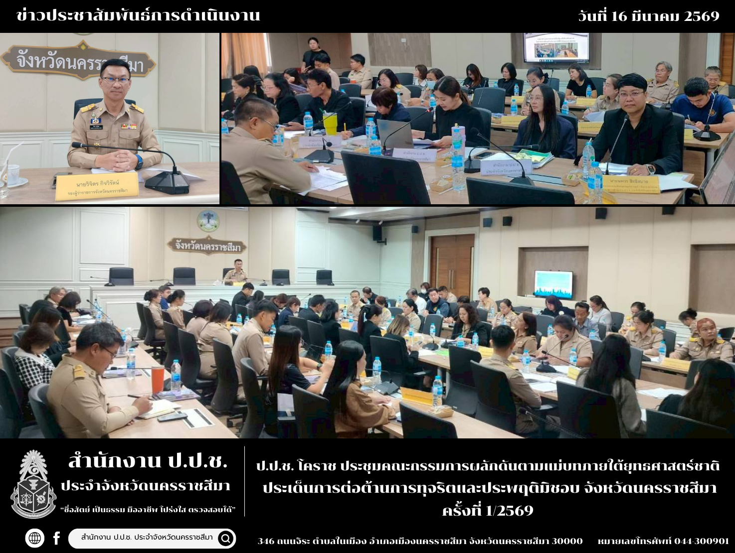 วันที่ 16 มีนาคม 2569 สำนักงาน ป.ป.ช. ประจำจังหวัดนครราชสีมา ในฐานะกรรมการและเลขานุการ ได้ดำเนินการจัดประชุมคณะกรรมการผลักดันการดำเนินงานตามแม่บทภายใต้ยุทธศาสตร์ชาติ ประเด็นการต่อต้านการทุจริตและประพฤติมิชอบ จังหวัดนครราชสีมา ครั้งที่ 1 ประจำปีงบประมาณ พ.ศ. 2569 ณ ห้องประชุมหลวงพ่อคูณ ปริสุทฺโธ ศาลากลางจังหวัดนครราชสีมา ตำบลในเมือง อำเภอเมืองนครราชสีมา จังหวัดนครราชสีมา โดยนายอนุพงศ์ สุขสมนิตย์ ผู้ว่าราชการจังหวัดนครราชสีมา มอบหมาย นายวิจิตร กิจวิรัตน์ เป็นประธานเปิดการประชุมฯ โดยมีวาระเสนอเพื่อทราบ และวาระสืบเนื่อง/ติดตาม ดังนี้