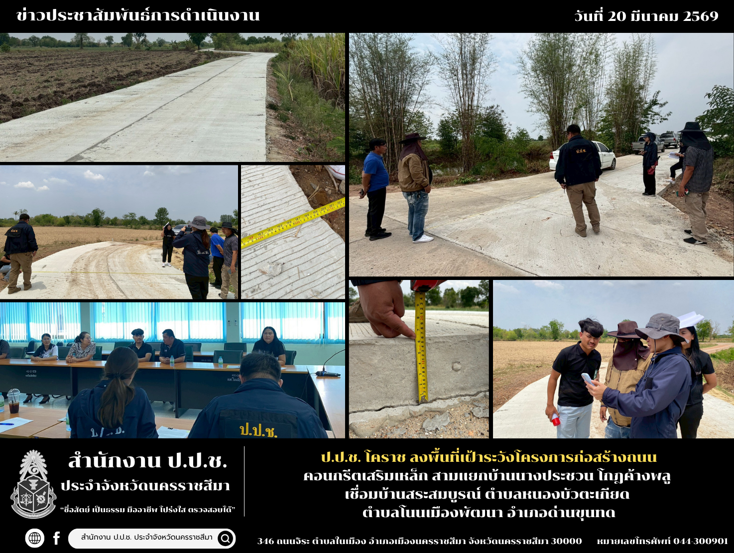 วันที่ 20 มีนาคม 2569 ผู้อำนวยการสำนักงาน ป.ป.ช. ประจำจังหวัดนครราชสีมา มอบหมายเจ้าหน้าที่กลุ่มงานป้องกันการทุจริต ร่วมกับเจ้าหน้าที่งานสืบสวนคดีทุจริต ลงพื้นที่ติดตาม เฝ้าระวัง และสังเกตการณ์การดำเนินโครงการก่อสร้างถนนคอนกรีตเสริมเหล็ก สามแยกบ้านนางประชวน โกฎค้างพลู เชื่อมบ้านสระสมบูรณ์ ตำบลหนองบัวตะเกียด ตำบลโนนเมืองพัฒนา อำเภอด่านขุนทด จังหวัดนครราชสีมา