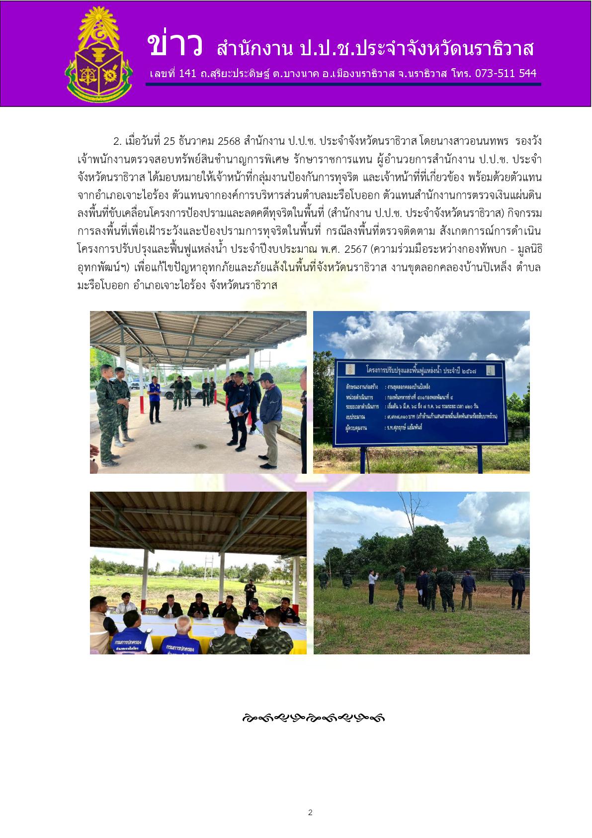 เมื่อวันที่ 5 กุมภาพันธ์ 2569 เจ้าหน้าที่สำนักงาน ป.ป.ช. ภาค 9 ร่วมกับ ป.ป.ช. นราธิวาส ลงพื้นที่ตรวจสอบและสังเกตการณ์โครงการตามแผนการขับเคลื่อนเศรษฐกิจ ภายใต้กรอบวงเงิน 157,000 ล้านบาท งบประมาณรายจ่ายประจำปีงบประมาณ พ.ศ. 2568 งบกลางรายการค่าใช้จ่าย...