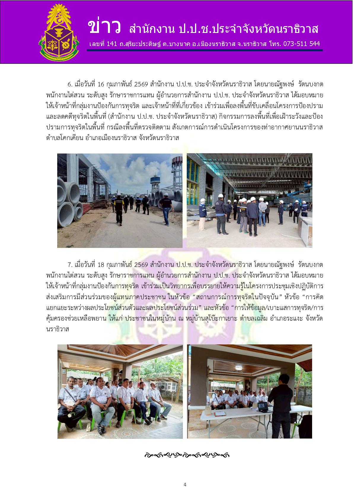 เมื่อวันที่ 16 กุมภาพันธ์ 2569 สำนักงาน ป.ป.ช. ประจำจังหวัดนราธิวาส โดยนายณัฐพงษ์ รัตนบงกตพนักงานไต่สวน ระดับสูง รักษาราชการแทน ผู้อำนวยการสำนักงาน ป.ป.ช. ประจำจังหวัดนราธิวาส ได้มอบหมายให้เจ้าหน้าที่กลุ่มงานป้องกันการทุจริต และเจ้าหน้าที่ที่เกี่ยวข้...