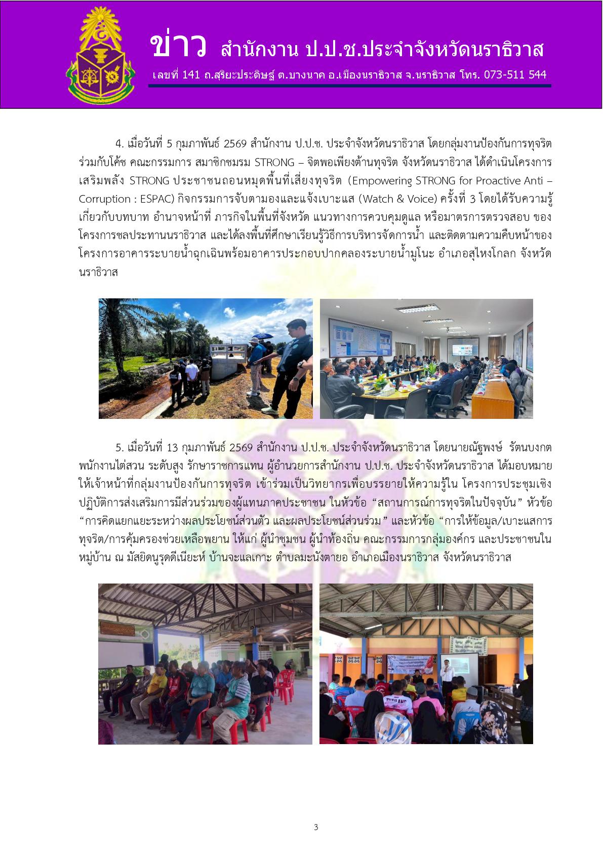 เมื่อวันที่ 4 กุมภาพันธ์ 2569 สำนักงาน ป.ป.ช. ประจำจังหวัดนราธิวาส โดยกลุ่มงานป้องกันการทุจริต ร่วมกับโค้ช คณะกรรมการ สมาชิกชมรม STRONG – จิตพอเพียงต้านทุจริต จังหวัดนราธิวาส ได้ดำเนินโครงการเสริมพลัง STRONG ประชาชนถอนหมุดพื้นที่เสี่ยงทุจริต (E...