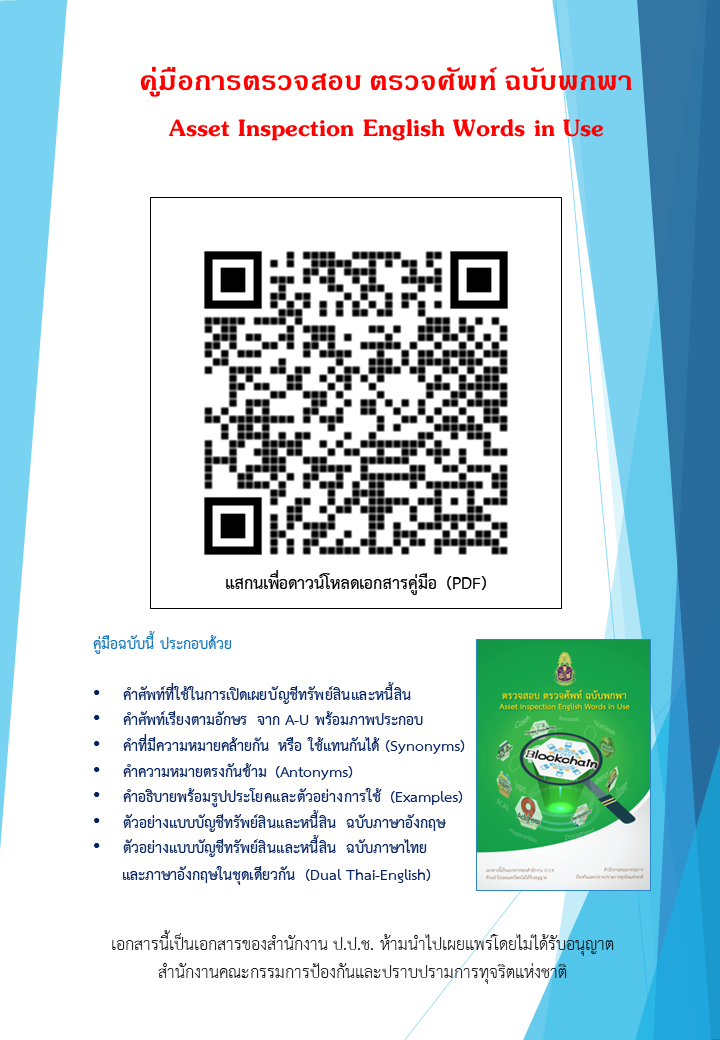 ในคู่มือ เล่มนี้ คุณจะได้พบกับ - คำศัพท์ที่ใช้ในการเปิดเผยบัญชีทรัพย์สินและหนี้สิน - คำศัพท์เรียงตามอักษร จาก A - U พร้อมภาพประกอบ - คำที่มีความหมายคล้ายกัน หรือใช้แทนกันได้ (Synonyms) - คำความหมายตรงกันข้าม (Antonyms) - คำอธิบายพร้อมรูปประโยคและตัวอย่างการใช้ (Examples) - ตัวอย่างแบบบัญชีทรัพย์สิ