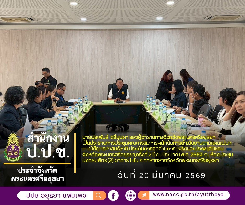 🗓 วันที่ 20 มีนาคม 2569 เวลา 10.00 น. นายประพันธ์ ตรีบุบผา รองผู้ว่าราชการจังหวัดพระนครศรีอยุธยา เป็นประธานการประชุมคณะกรรมการผลักดันการดำเนินงานตามแผนแม่บทภายใต้ยุทธศาสตร์ชาติ ประเด็นการต่อต้านการทุจริตและประพฤติมิชอบจังหวัดพระนครศรีอยุธยา ครั้งที่ 2 ปีงบประมาณ พ.ศ. 2569 ณ ห้องประชุมมงคลบพิตร (2) อาคาร 1 ชั้น 4 ศาลากลางจังหวัดพระนครศรีอยุธยา