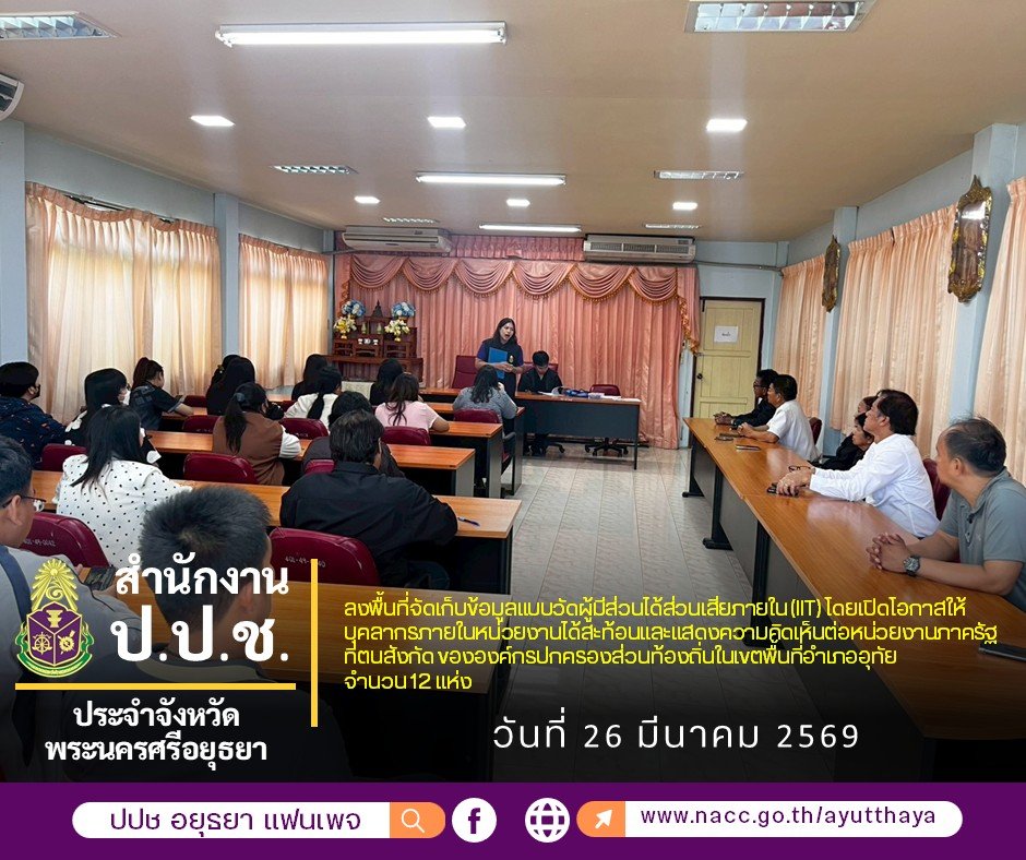 🗓 วันที่ 26 มีนาคม 2569 นายปริญญา วิกุลศิริรัตน์ ผู้อำนวยการสำนักงาน ป.ป.ช. ประจำจังหวัดพระนครศรีอยุธยา มอบหมายให้กลุ่มงานป้องกันการทุจริต ลงพื้นที่จัดเก็บข้อมูลแบบวัดผู้มีส่วนได้ส่วนเสียภายใน (IIT) โดยเปิดโอกาสให้บุคลากรภายในหน่วยงานได้สะท้อนและแสดงความคิดเห็นต่อหน่วยงานภาครัฐที่ตนสังกัด ขององค์กรปกครองส่วนท้องถิ่นในเขตพื้นที่อำเภออุทัย จำนวน 12 แห่ง ดังนี้