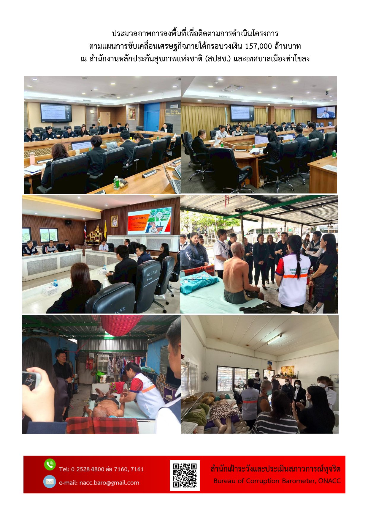 ต่อมาในช่วงบ่าย เจ้าหน้าที่สำนักงาน ป.ป.ช. เจ้าหน้าที่สำนักงาน ป.ป.ท. และเจ้าหน้าที่ สปสช. ได้ลงพื้นที่ติดตามการดำเนินการโครงการในพื้นที่ ณ เทศบาลเมืองท่าโขลง ตำบลคลองหนึ่ง อำเภอคลองหลวง จังหวัดปทุมธานี โดยประชุมร่วมกับผู้บริหารและเจ้าหน้าที่เทศบาลเมืองท่าโขลง ซึ่งทางเทศบาลเมืองท่าโขลง ได้ชี้แจงข้อมูลรายละเอียดการดำเนินโครงการในพื้นที่ พร้อมทั้งเดินทางไปตรวจเยี่ยมการปฏิบัติหน้าที่ของผู้ช่วยเหลือดูแลผู้ที่มีภาวะพึ่งพิง (Caregiver) ตามโครงการในพื้นที่เทศบาลเมืองท่าโขลง