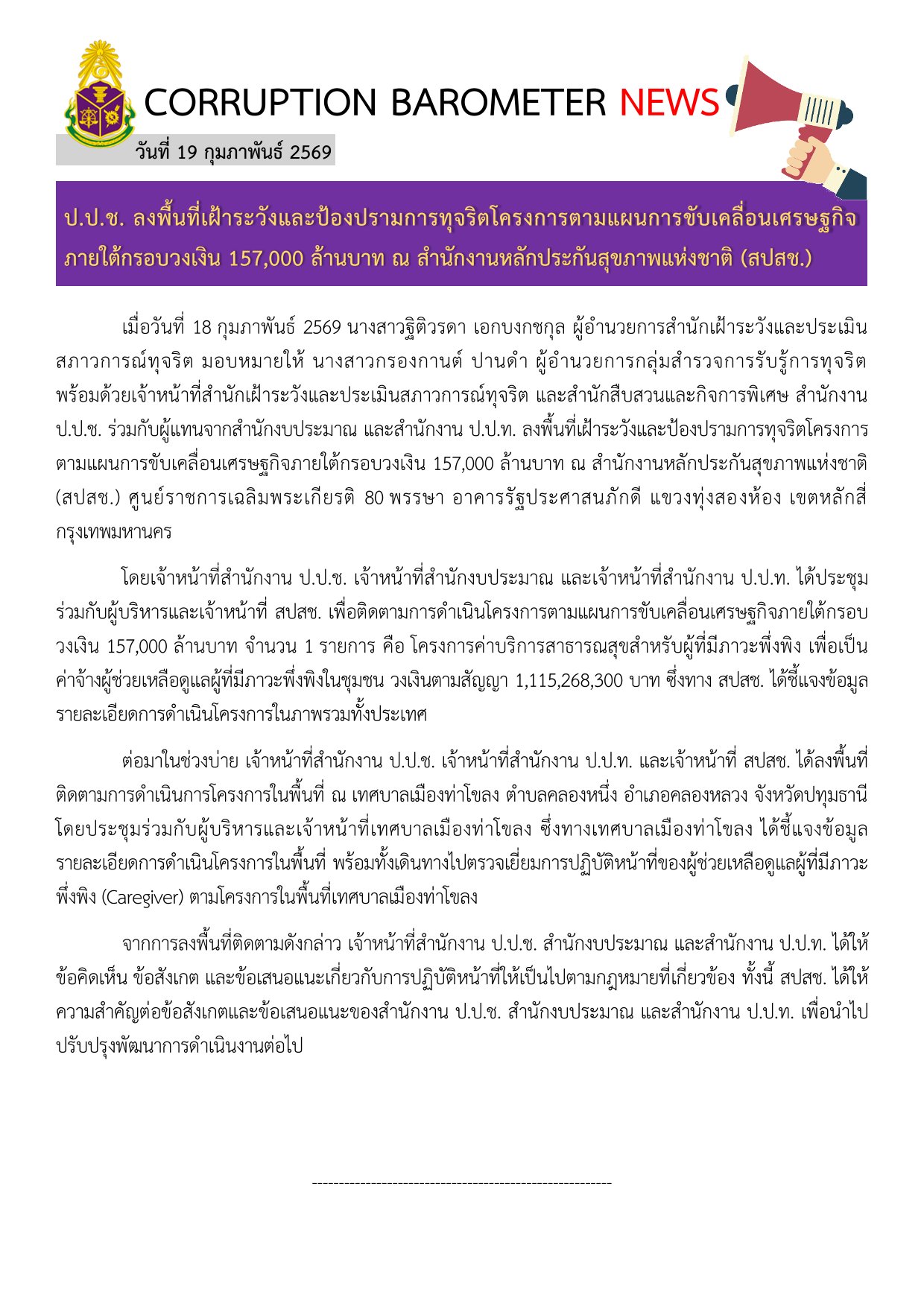 เมื่อวันที่ 18 กุมภาพันธ์ 2569 นางสาวฐิติวรดา เอกบงกชกุล ผู้อำนวยการสำนักเฝ้าระวังและประเมินสภาวการณ์ทุจริต มอบหมายให้ นางสาวกรองกานต์ ปานดำ ผู้อำนวยการกลุ่มสำรวจการรับรู้การทุจริต พร้อมด้วยเจ้าหน้าที่สำนักเฝ้าระวังและประเมินสภาวการณ์ทุจริต และสำนักสืบสวนและกิจการพิเศษ สำนักงาน ป.ป.ช. ร่วมกับผู้แทนจากสำนักงบประมาณ และสำนักงาน ป.ป.ท. ลงพื้นที่เฝ้าระวังและป้องปรามการทุจริตโครงการตามแผนการขับเคลื่อนเศรษฐกิจภายใต้กรอบวงเงิน 157,000 ล้านบาท ณ สำนักงานหลักประกันสุขภาพแห่งชาติ (สปสช.) ศูนย์ราชการเฉลิมพระเกียรติ 80 พรรษา อาคารรัฐประศาสนภักดี แขวงทุ่งสองห้อง เขตหลักสี่ กรุงเทพมหานคร