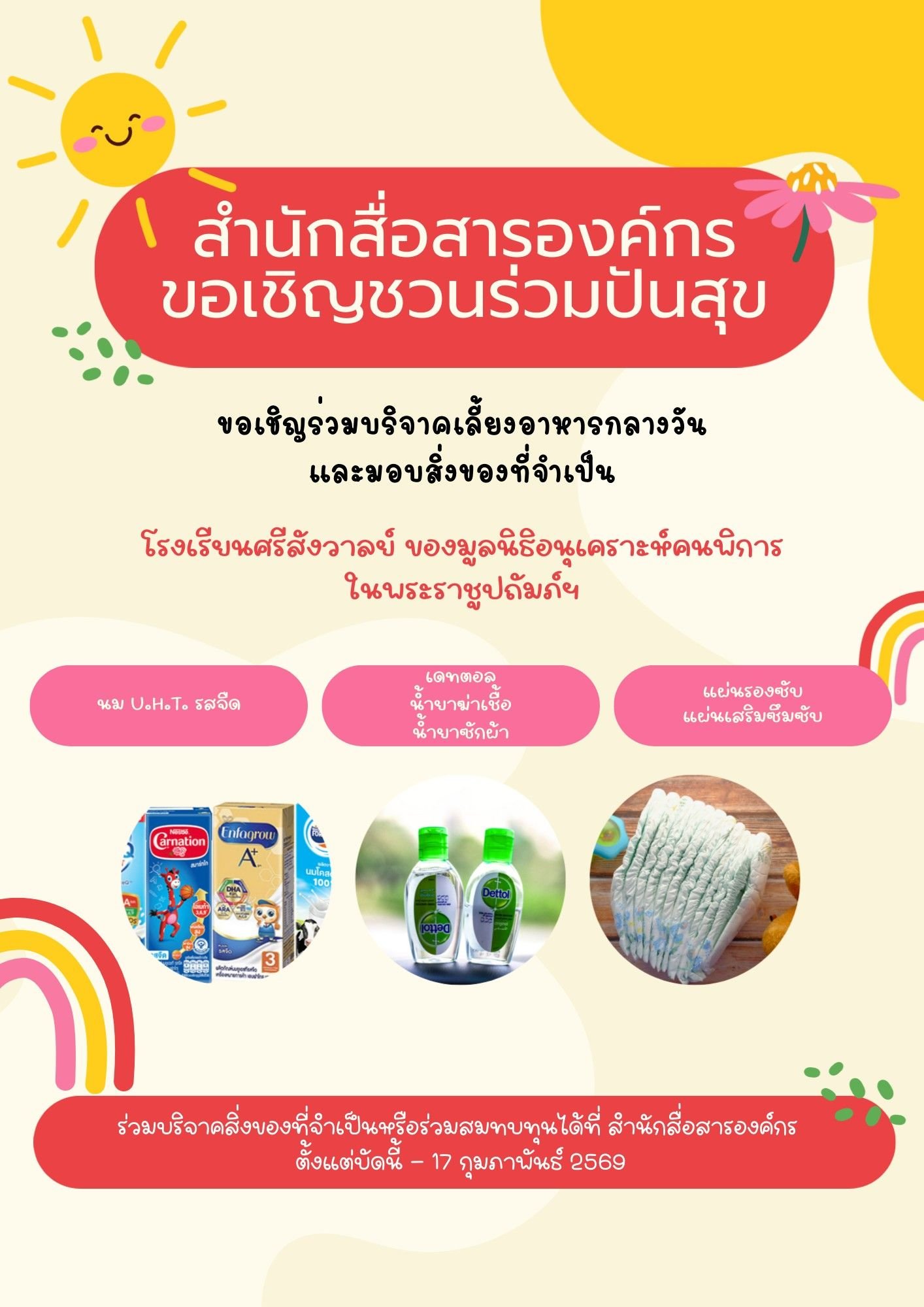 “สำนักสื่อสารองค์กร ร่วมปันสุข บริจาคเลี้ยงอาหารกลางวันและมอบสิ่งของที่จำเป็น ณ โรงเรียนศรีสังวาลย์ ของมูลนิธิอนุเคราะห์คนพิการในพระราชูปถัมภ์”