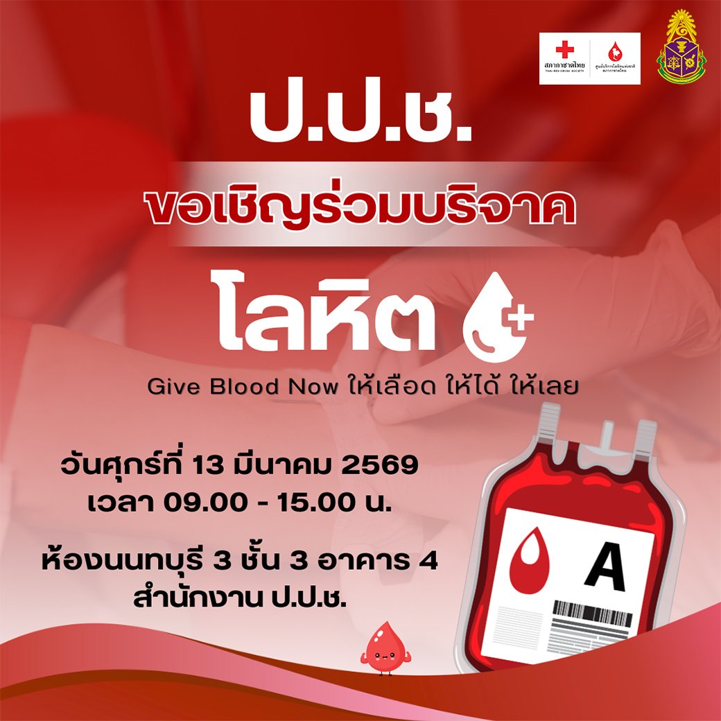 📌 สำนักงาน ป.ป.ช. ร่วมกับศูนย์บริการโลหิตแห่งชาติ สภากาชาดไทย เชิญชวนร่วมบริจาคโลหิต ขอเชิญชวนร่วมบริจาคโลหิต ภายใต้โครงการ “Give Blood Now - ให้เลือด ให้ได้ ให้เลย” โดยกำหนดเปิดรับบริจาคโลหิต ครั้งที่ 1 ประจำปี 2569 ในวันศุกร์ที่ 13 มีนาคม 2569 ระหว่างเวลา 09.00 – 15.00 น. ณ ห้องนนทบุรี 3 ชั้น 3 อาคาร 4 สำนักงาน ป.ป.ช. ถนนนนทบุรี จังหวัดนนทบุรี