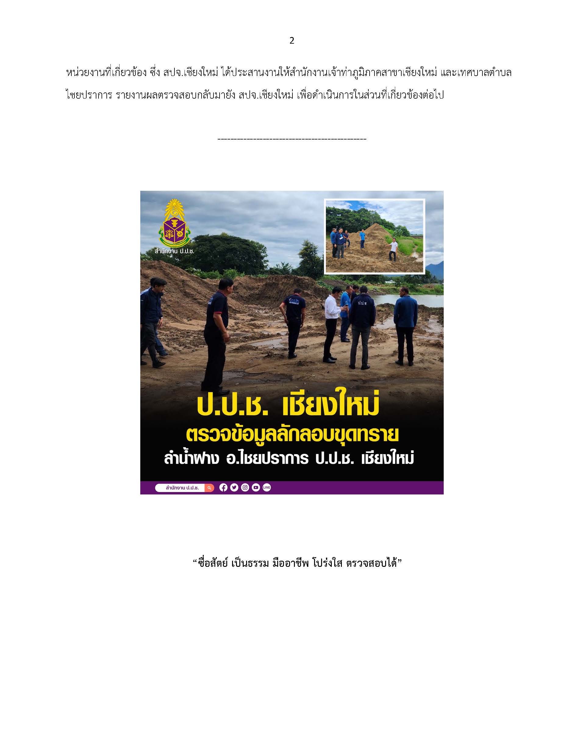 ป.ป.ช. เชียงใหม่ ลงพื้นที่ตรวจสอบข้อมูลเบื้องต้น กรณีความเสี่ยงการทุจริต เกี่ยวกับการลักลอบขุดทรายเปลี่ยนเส้นทางน้ำเพื่อการเกษตร ในลำน้ำฝาง ต.ศรีดงเย็น อ.ไชยปราการ จังหวัดเชียงใหม่