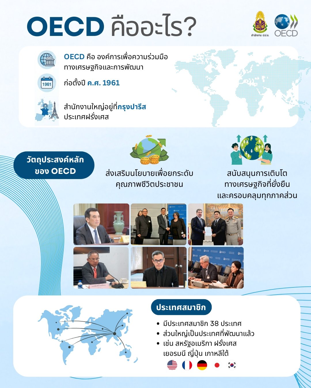 หน้าหลัก ข่าวประชาสัมพันธ์ 📍เกร็ดความรู้...สู้ทุจริต ‼️ 📘 OECD คืออะไร? 📍เกร็ดความรู้...สู้ทุจริต ‼️ 📘 OECD คืออะไร? จากไชต์: สำนักงาน ป.ป.ช. ประจำจังหวัดพังงา จำนวนผู้เข้าชม: 148 21/01/2569 เกร็ดความรู้...สู้ทุจริต OECD คืออะไร? OECD หรือองค์การเพื่อความร่วมมือทางเศรษฐกิจและการพัฒนา คือองค์การระหว่างประเทศที่ก่อตั้งขึ้นในปี ค.ศ. 1961 มีสำนักงานใหญ่ที่กรุงปารีส ประเทศฝรั่งเศส ทำหน้าที่ส่งเสริมนโยบายเพื่อยกระดับคุณภาพชีวิต ผ่านการพัฒนาเศรษฐกิจที่ยั่งยืนและครอบคลุม ปัจจุบันมีประเทศสมาชิก 38 ประเทศ ส่วนใหญ่เป็นประเทศพัฒนาแล้วทั่วโลก Related 27/02/2569 สำนักงาน ป.ป.ช. ประจำจังหวัดพังงา เผยแพร่ผลการดำเนินงานและกิจกรรมประจำเดือนกุมภาพันธ์ 2569 21/02/2569 เกร็ดความรู้...สู้ทุจริต ก้าวสู่มาตรฐานสากลในการต่อต้านคอร์รัปชัน สร้างความโปร่งใสในเวทีการค้าระหว... เกร็ดความรู้...สู้ทุจริต ก้าวสู่มาตรฐานสากลในการต่อต้านคอร์รัปชัน สร้างความโปร่งใสในเวทีการค้าระหว่างประเทศ การให้สินบนเจ้าหน้าที่ของรัฐต่างประเทศไม่เพียงบั่นทอนความเชื่อมั่น แต่ยังส่งผลกระทบต่อเศรษฐกิจและความเป็นธรรมทางการแข่งขันในระดับโลก... 07/02/2569 เกร็ดความรู้...สู้ทุจริต การเมืองดี... เริ่มที่มือเรา "ไม่รับ ไม่ขาย ไม่เลือกคนโกง" เกร็ดความรู้...สู้ทุจริต การเมืองดี... เริ่มที่มือเรา "ไม่รับ ไม่ขาย ไม่เลือกคนโกง" หยุดคิดว่าเงินซื้อเสียงเป็นเรื่องเล็กน้อย เพราะนี่คือจุดเริ่มต้นของหายนะที่กัดกินประเทศ เมื่อเรายอมรับเงิน เท่ากับเราเปิดประตูให้ "นักลงทุนทางการเมือง" เข้ามาหาก... 06/02/2569 เกร็ดความรู้...สู้ทุจริต เกร็ดความรู้...สู้ทุจริต รู้หรือไม่? ประเทศไทยมีความสัมพันธ์และความร่วมมือกับ OECD มาอย่างยาวนานกว่า 20 ปี โดยในปี พ.ศ. 2567 รัฐบาลไทยได้ยื่นหนังสือแสดงเจตจำนงในการเข้าเป็นสมาชิก OECD และในปี พ.ศ. 2568 ได้เริ่มกระบวนการเข้าเป็นภาคีอนุสัญญา OECD... 05/02/2569 เกร็ดความรู้...สู้ทุจริต เมื่อการเลือกตั้งคือ "การลงทุน" การทุจริตจึงเป็นหนทาง "ถอนทุนคืน" เกร็ดความรู้...สู้ทุจริต เมื่อการเลือกตั้งคือ "การลงทุน" การทุจริตจึงเป็นหนทาง "ถอนทุนคืน" เคยสงสัยไหมว่าทำไมการซื้อเสียงถึงไม่เคยหมดไป? คำตอบคือมันไม่ใช่แค่การแจกเงิน แต่มันคือ "ต้นทุนทางธุรกิจ" ของนักการเมือง เมื่อลงทุนไปแล้ว ก็ต้องเข้าไปกอบโกย... 05/02/2569 เกร็ดความรู้...สู้ทุจริต คอร์รัปชันไม่ได้เกิดขึ้นในวันเดียว แต่มักเริ่มต้นตั้งแต่วินาทีที่อำนาจถูกได... เกร็ดความรู้...สู้ทุจริต คอร์รัปชันไม่ได้เกิดขึ้นในวันเดียว แต่มักเริ่มต้นตั้งแต่วินาทีที่อำนาจถูกได้มาอย่างไม่สุจริต เมื่อการเ