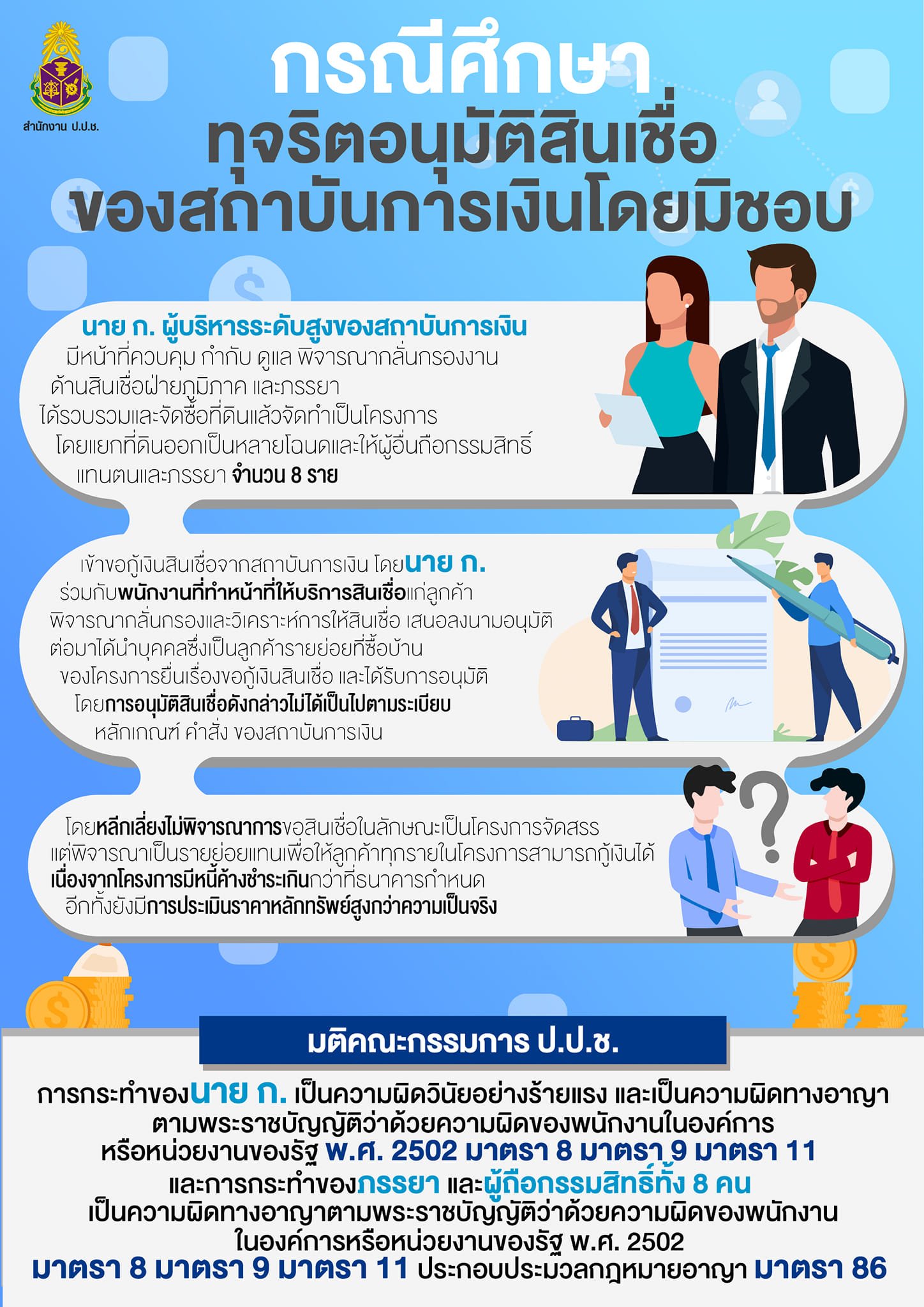 ข้อเท็จจริง นาย ก. ผู้บริหารระดับสูงของสถาบันการเงิน มีหน้าที่ควบคุม กำกับ ดูแล พิจารณากลั่นกรองงานด้านสินเชื่อฝ่ายภูมิภาค และภรรยา ได้รวบรวมและจัดซื้อที่ดินแล้วจัดทำเป็นโครงการ โดยแยกที่ดินออกเป็นหลายโฉนดและให้ผู้อื่นถือกรรมสิทธิ์แทนตนและภรรยา จำนวน 8 ราย เข้าขอกู้เงินสินเชื่อจากสถาบันการเงิน โดยนาย ก. ร่วมกับพนักงานที่ทำหน้าที่ให้บริการสินเชื่อแก่ลูกค้า พิจารณากลั่นกรองและวิเคราะห์การให้สินเชื่อ เสนอลงนามอนุมัติ ต่อมาได้นำบุคคลซึ่งเป็นลูกค้ารายย่อยที่ซื้อบ้านของโครงการยื่นเรื่องขอกู้เงินสินเชื่อ และได้รับการอนุมัติ โดยการอนุมัติสินเชื่อดังกล่าวไม่ได้เป็นไปตามระเบียบหลักเกณฑ์ คำสั่ง ของสถาบันการเงิน โดยหลีกเลี่ยงไม่พิจารณาการขอสินเชื่อในลักษณะเป็นโครงการจัดสรร แต่พิจารณาเป็นรายย่อยแทนเพื่อให้ลูกค้าทุกรายในโครงการสามารถกู้เงินได้ เนื่องจากโครงการมีหนี้ค้างชำระเกินกว่าที่ธนาคารกำหนด อีกทั้งยังมีการประเมินราคาหลักทรัพย์สูงกว่าความเป็นจริง