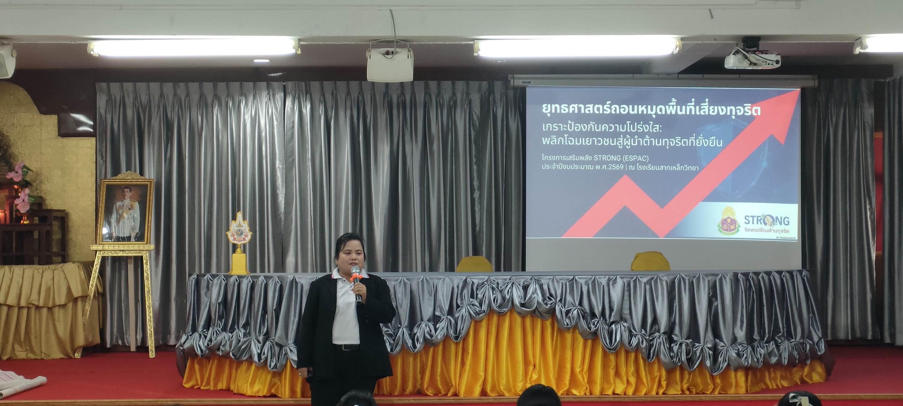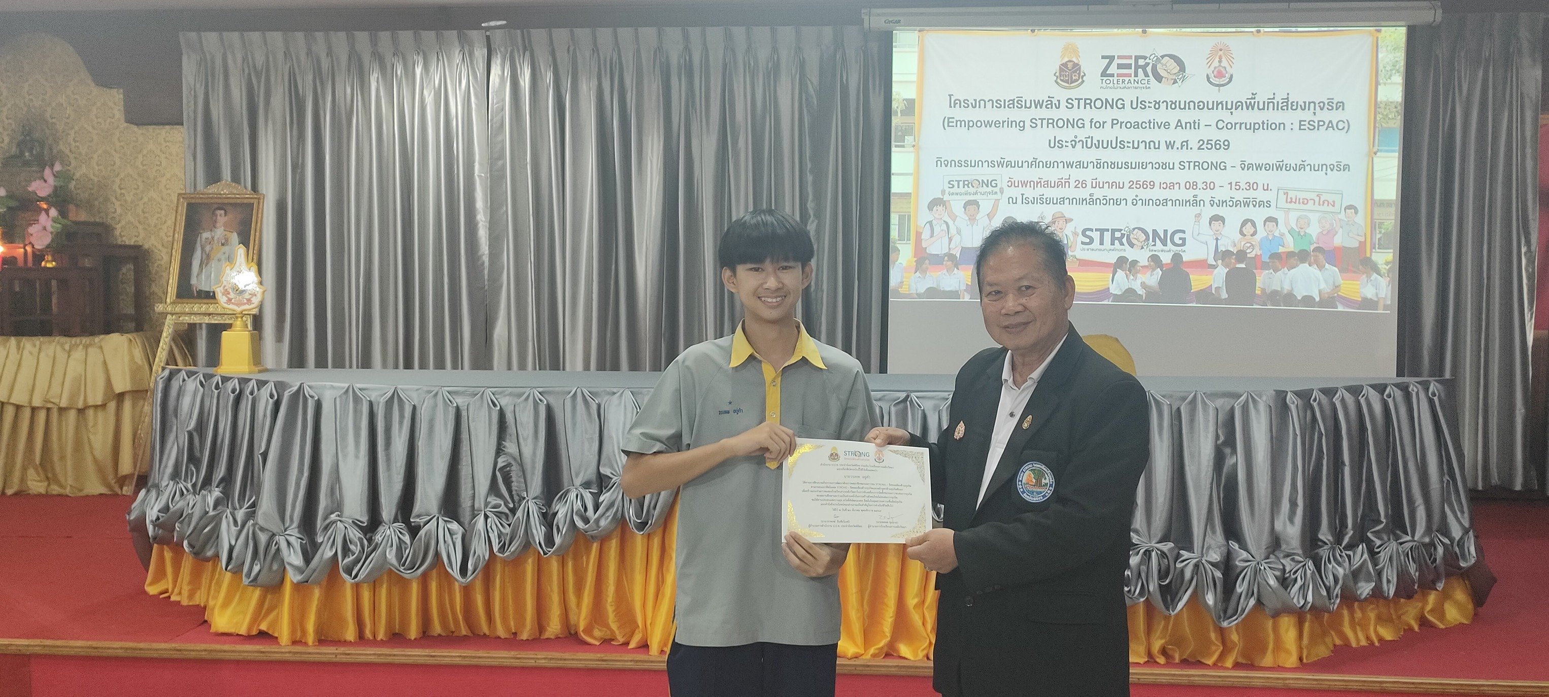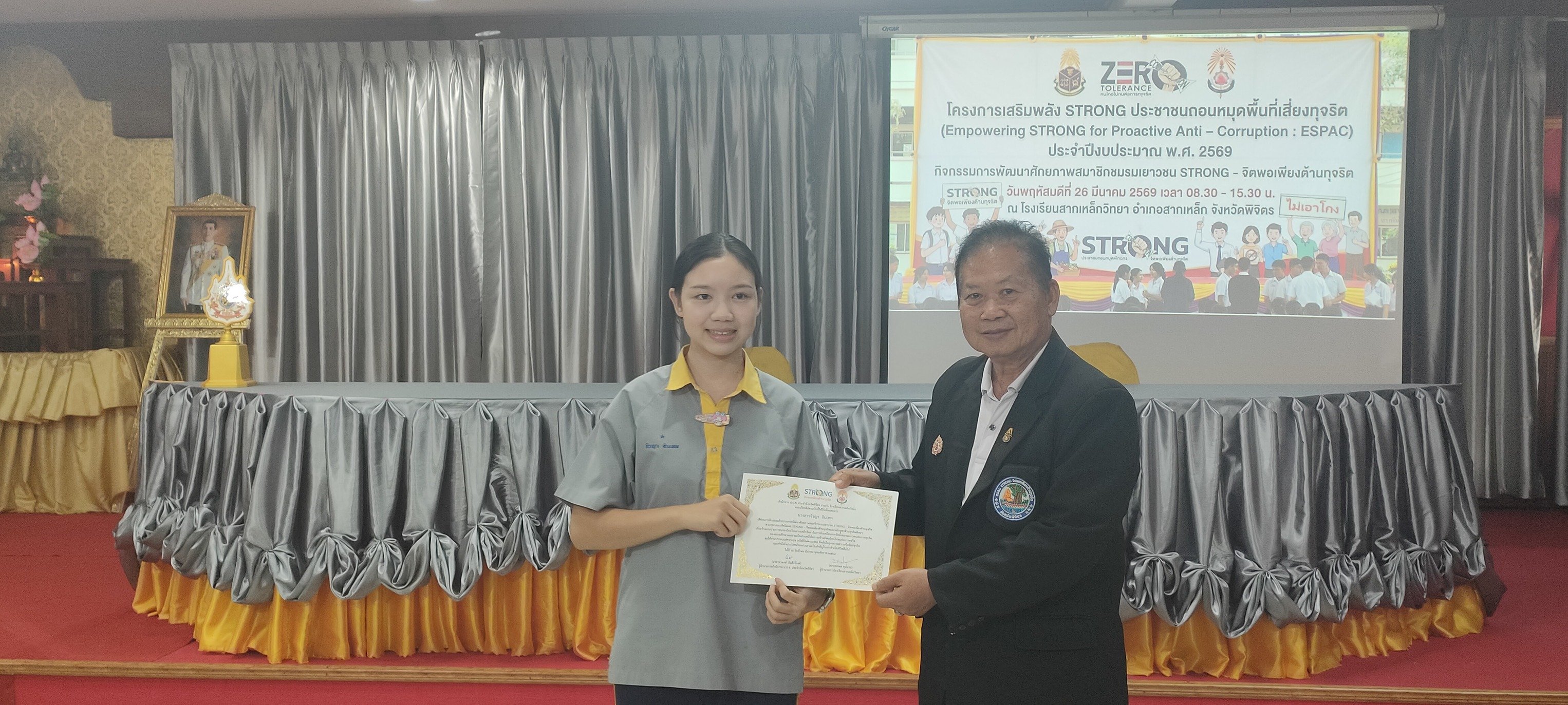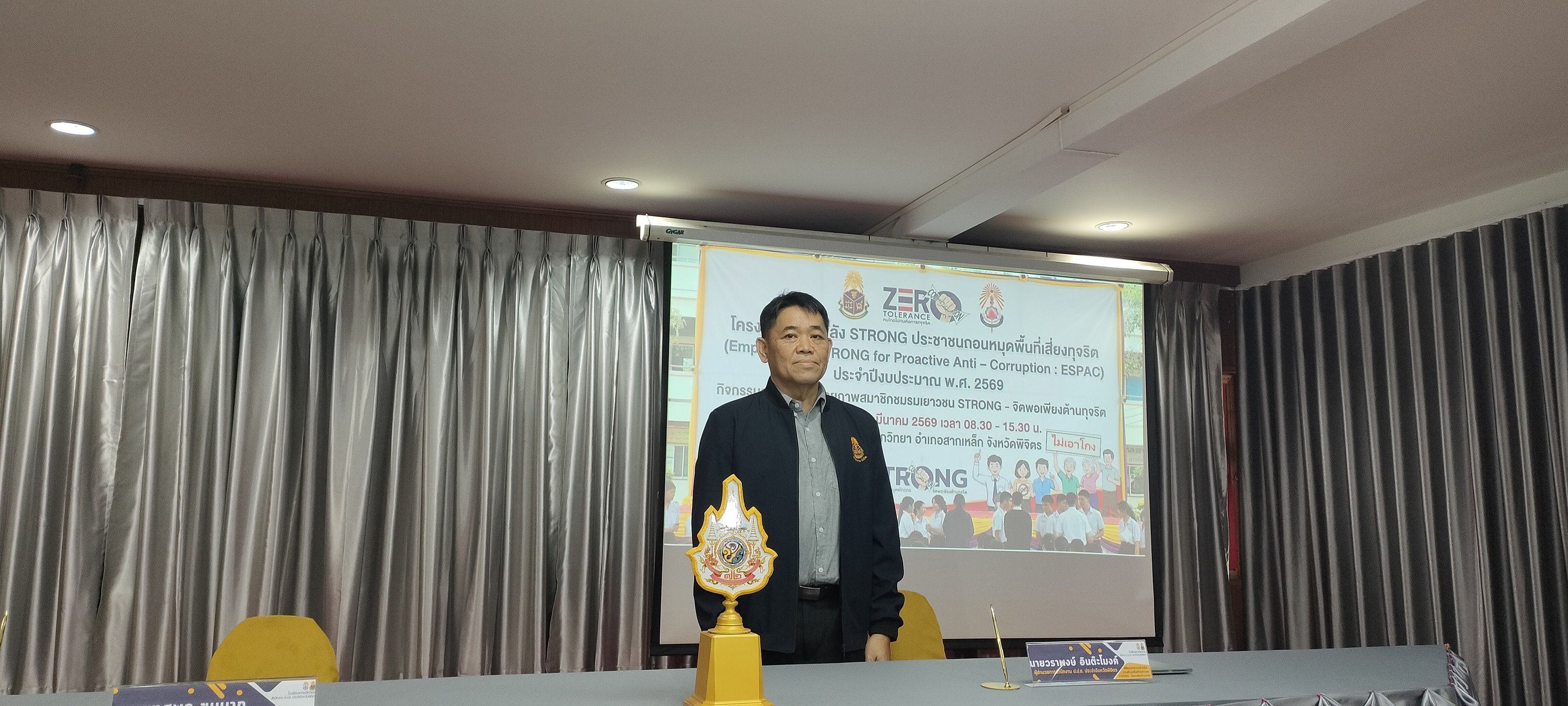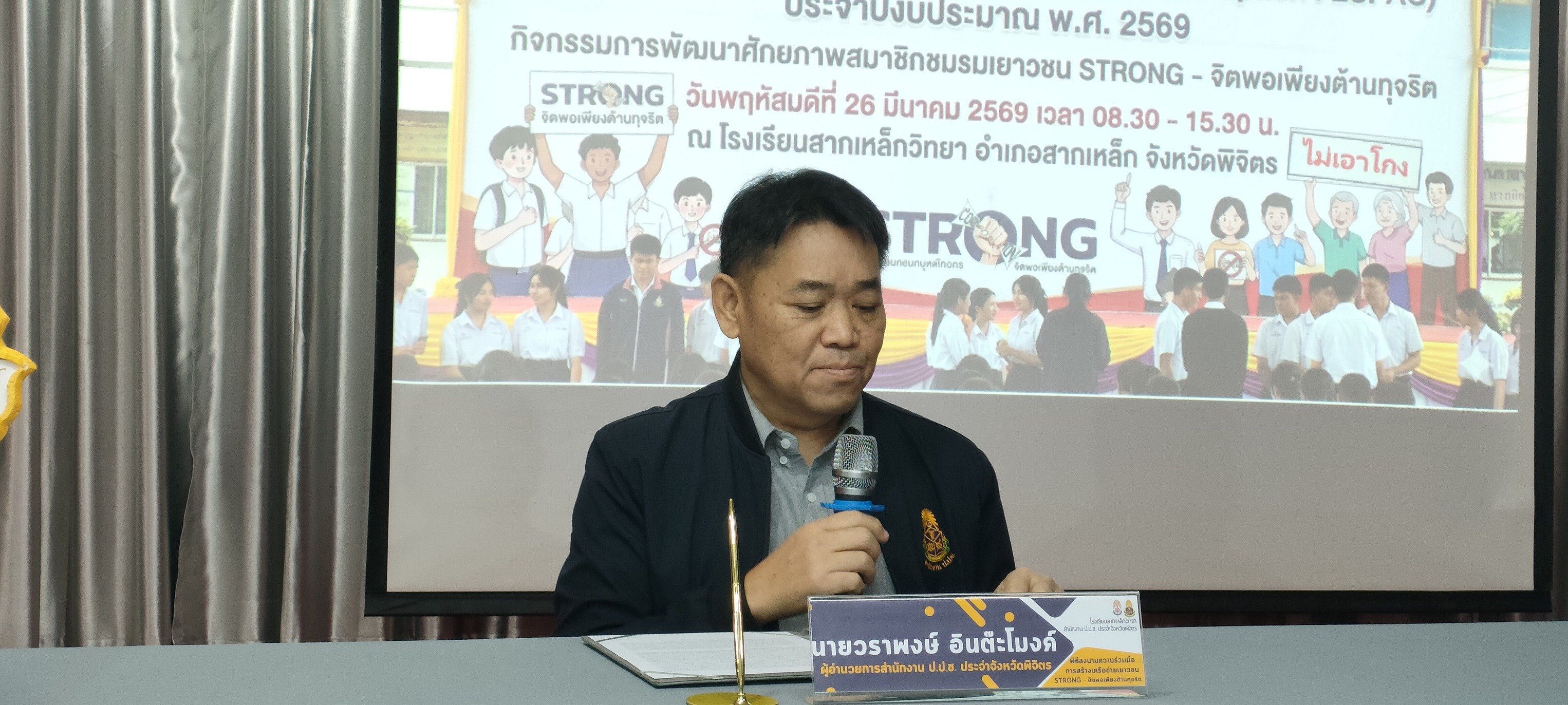 นายวราพงษ์ อินต๊ะโมงค์ ผู้อำนวยการสำนักงาน ป.ป.ช. ประจำจังหวัดพิจิตร และกลุ่มงานป้องกันการทุจริต จัดประชุมโครงการเสริมพลัง STRONG ประชาชนถอนหมุดพื้นที่เสี่ยงทุจริต (Empowering STRONG for Proactive Anti - Corruption : ESPAC) ประจำปีงบประมาณ พ.ศ. 2569 กิจกรรมการพัฒนาศักยภาพสมาชิกชมรมเยาวชน STRONG - จิตพอเพียงต้านทุจริต ณ โรงเรียนสากเหล็กวิทยา อำเภอสากเหล็ก จังหวัดพิจิตร กลุ่มเป้าหมายเป็นเยาวชนโรงเรียนสากเหล็กวิทยา พร้อมด้วยวิทยากรจากโค้ช และสมาชิกชมรม STRONG – จิตพอเพียงต้านทุจริตจังหวัดพิจิตร ชมรม STRONG – จิตพอเพียงต้านทุจริตอำเภอสากเหล็ก และวิทยากรจากโรงเรียนสากเหล็กวิทยา เข้าร่วมกิจกรรมจำนวน 80 คน โดยมีวัตถุประสงค์เพื่อเสริมสร้างศักยภาพชมรมเยาวชน STRONG -จิตพอเพียงต้านทุจริตในการเป็นเครือข่ายต่อต้านการทุจริต การสร้างแกนนำเยาวชนโดยปลูกฝังแนวคิดเยาวชนไม่ทุจริต Anti Corruption Young Leaders ด้วยกรอบแนวคิดโมเดล STRONG - จิตพอเพียงต้านทุจริต เพื่อพัฒนาสถานศึกษาและชุมชน และพิธีลงนามความร่วมมือการสร้างเครือข่ายเยาวชน STRONG - จิตพอเพียงต้านทุจริตและการสร้างกลไกเยาวชนต้านทุจริตในสถานศึกษา ระหว่างสำนักงาน ป.ป.ช. ประจำจังหวัดพิจิตร และโรงเรียนสากเหล็กวิทยา และกิจกรรมกระบวนการระดมความคิดเรื่องเยาวชนโรงเรียนสากเหล็กวิทยากับการกำหนดแนวทางการจัดตั้งและดำเนินกิจกรรมชมรมเยาวชนต่อต้านการทุจริตของสถานศึกษา ในการสะท้อนมุมมองการต่อต้านการทุจริตของเยาวชนและการนำเสนอผลงานคลิปวิดีโอสั้นในการต่อต้านการทุจริต เพื่อเป็นการแลกเปลี่ยนความคิดเห็นมุมมองของแต่ละกลุ่ม โดยช่วงท้ายของกิจกรรมได้มีพิธีมอบใบประกาศนียบัตรให้กับเยาวชนที่เข้ารับการอบรมในครั้งนี้ด้วย
