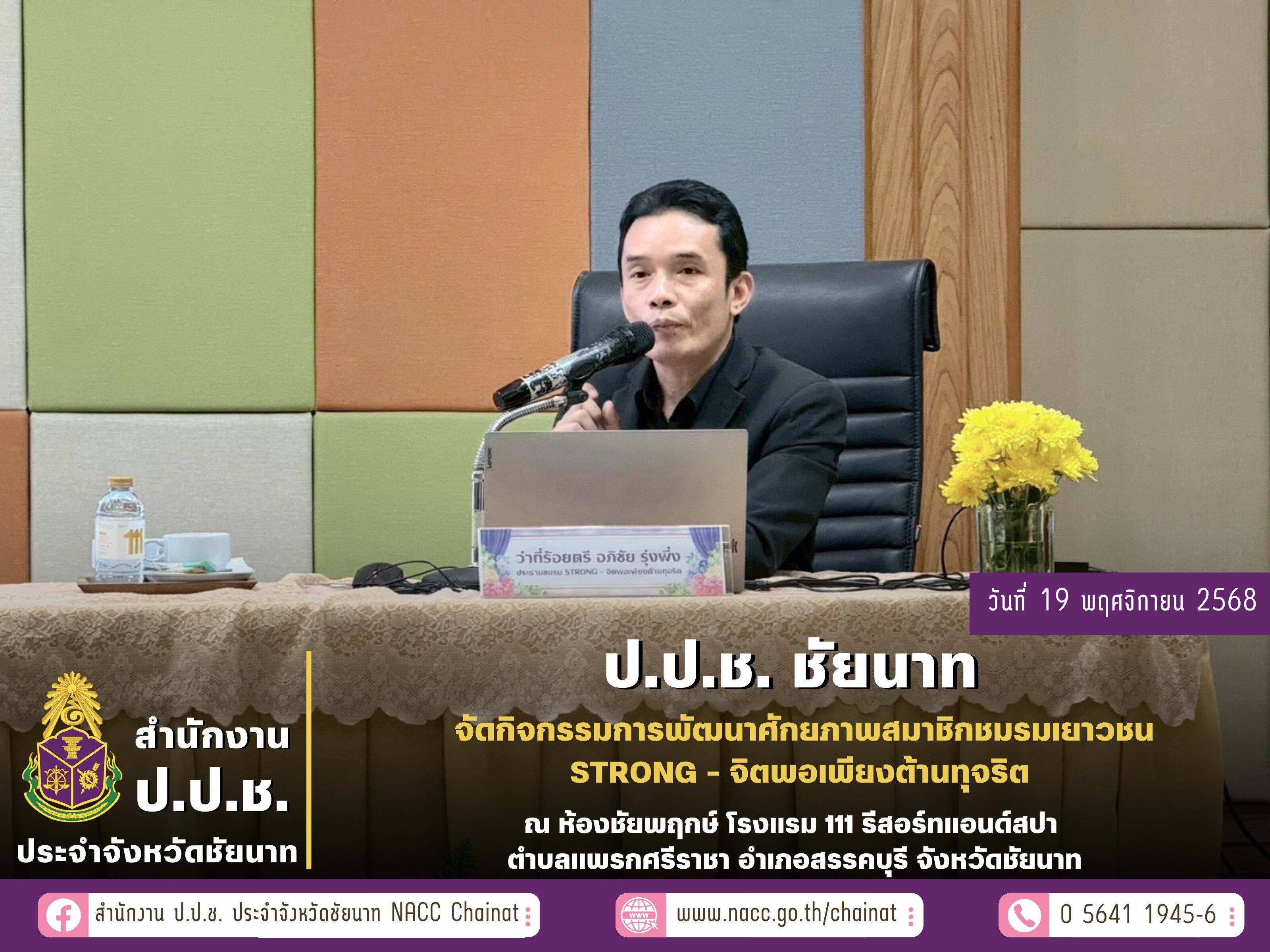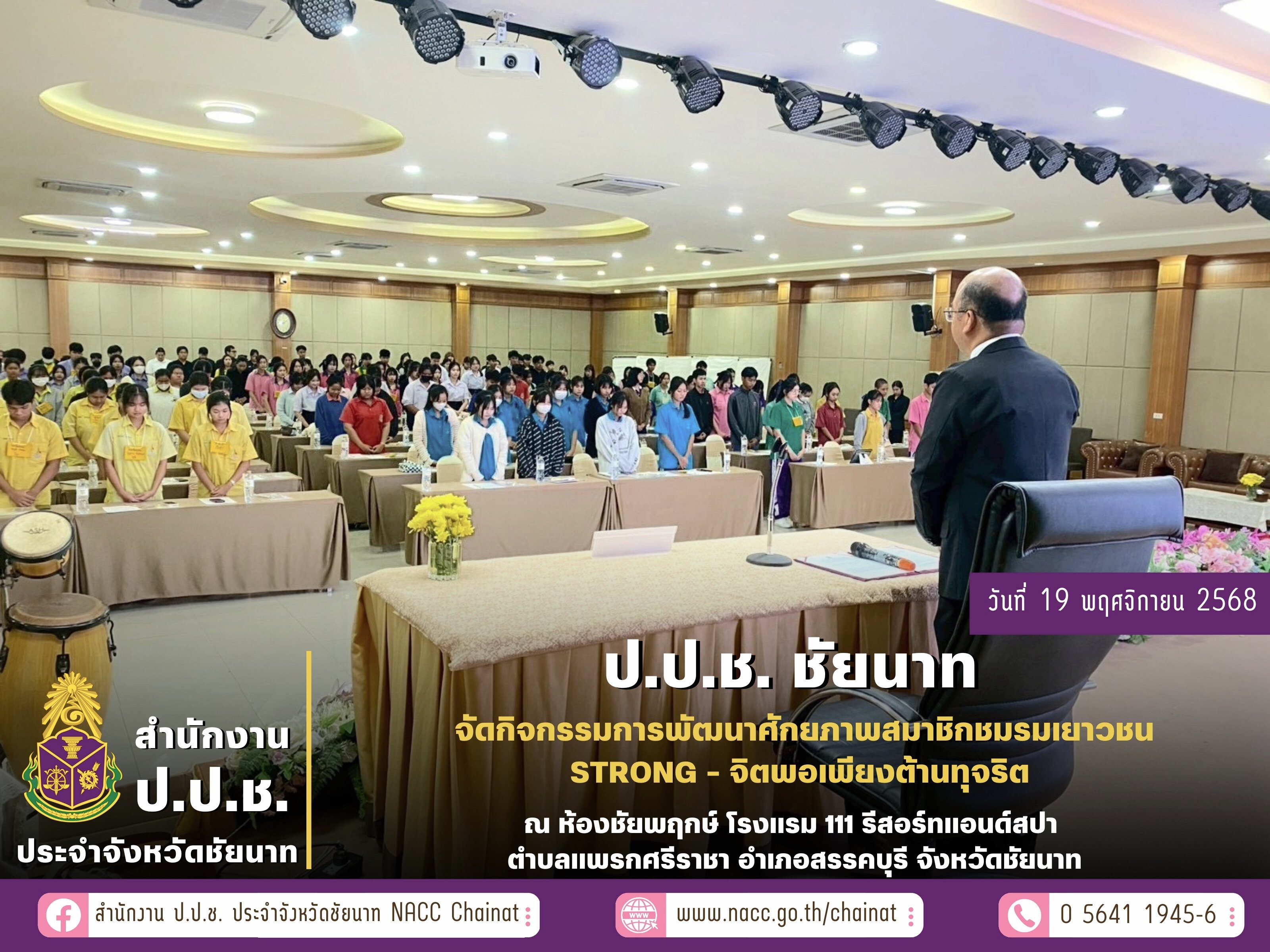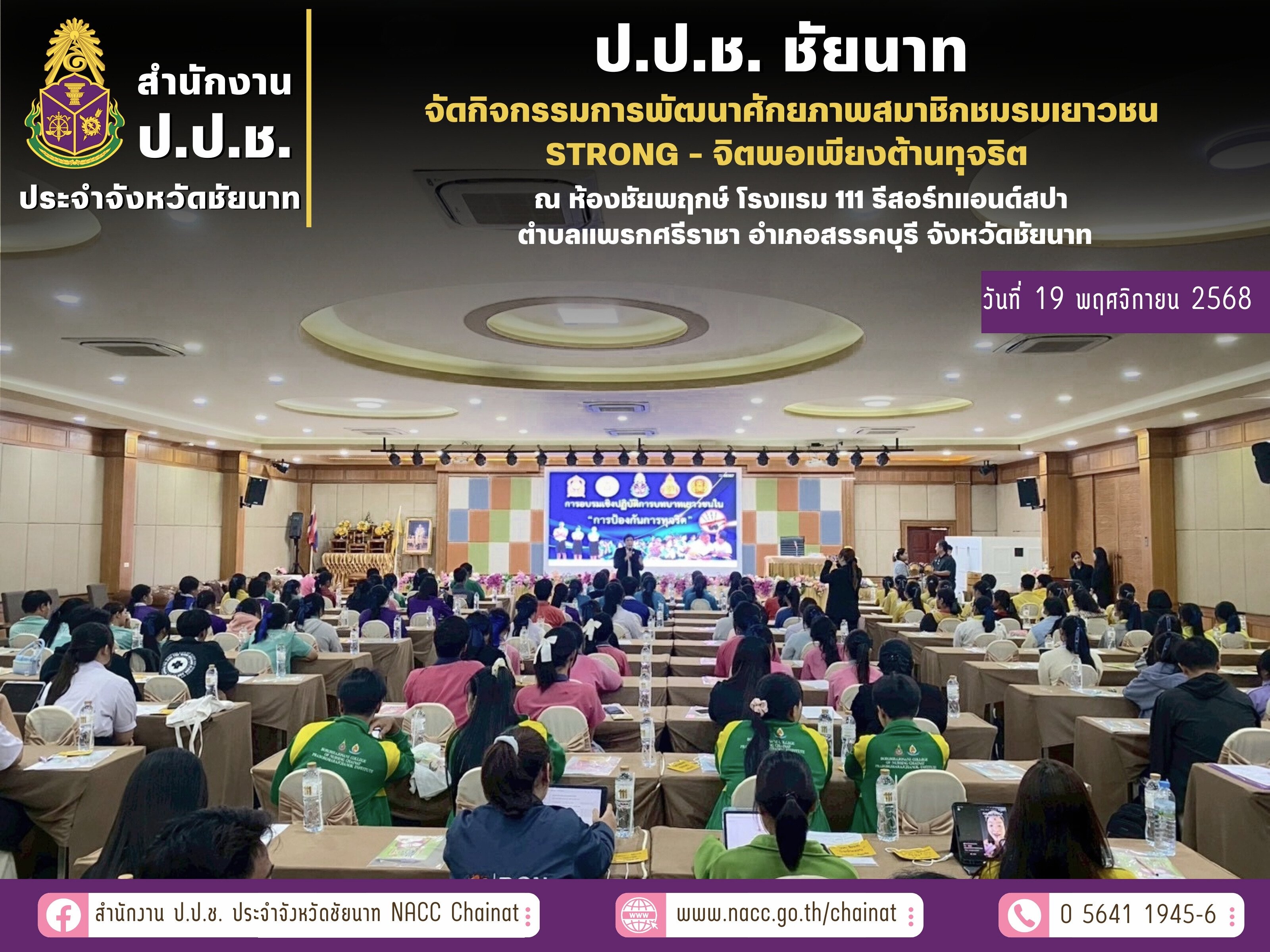 เมื่อวันที่ 19 พฤศจิกายน 2568 นายคมสันต์ จันทร์รอด ผู้อำนวยการสำนักงาน ป.ป.ช. ประจำจังหวัดชัยนาท มอบหมายให้กลุ่มงานป้องกันการทุจริต จัดกิจกรรมการพัฒนาศักยภาพสมาชิกชมรมเยาวชน STRONG - จิตพอเพียงต้านทุจริต ภายใต้โครงการเสริมพลัง STRONG ประชาชนถอนหมุดพื้นที่เสี่ยงทุจริต (ESPAC) ณ ห้องชัยพฤกษ์ โรงแรม 111 รีสอร์ทแอนด์สปา ตำบลแพรกศรีราชา อำเภอสรรคบุรี จังหวัดชัยนาท โดยมีเยาวชนเข้าร่วมจำนวน 135 คน