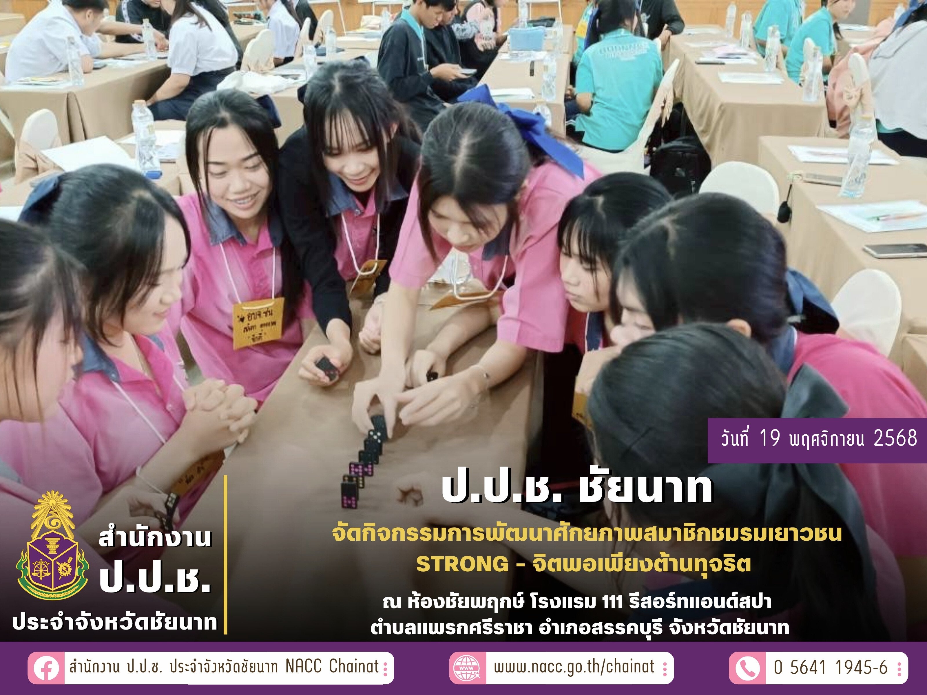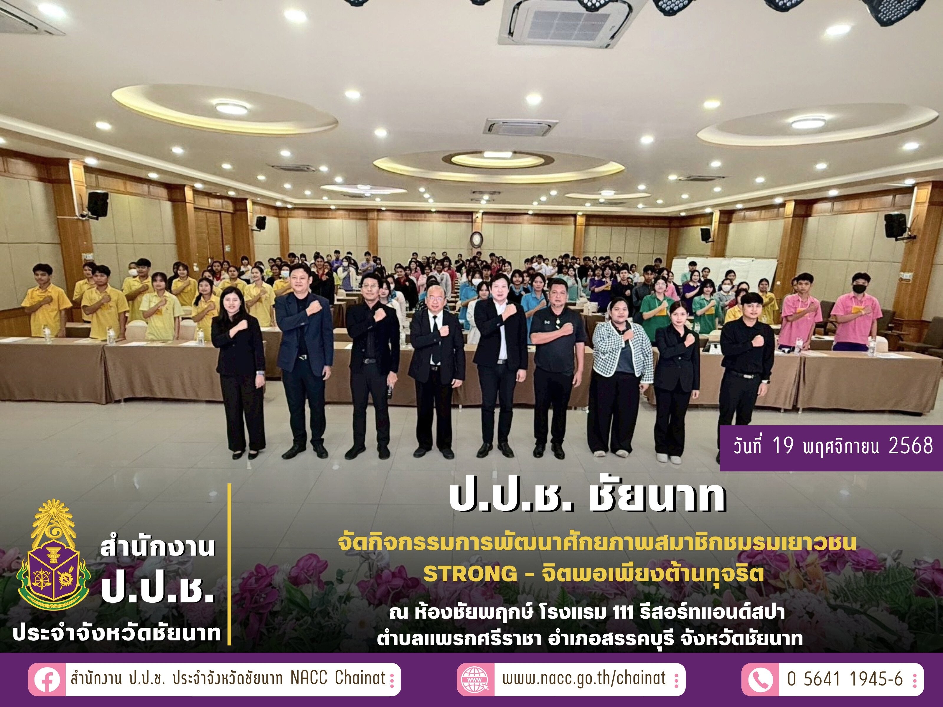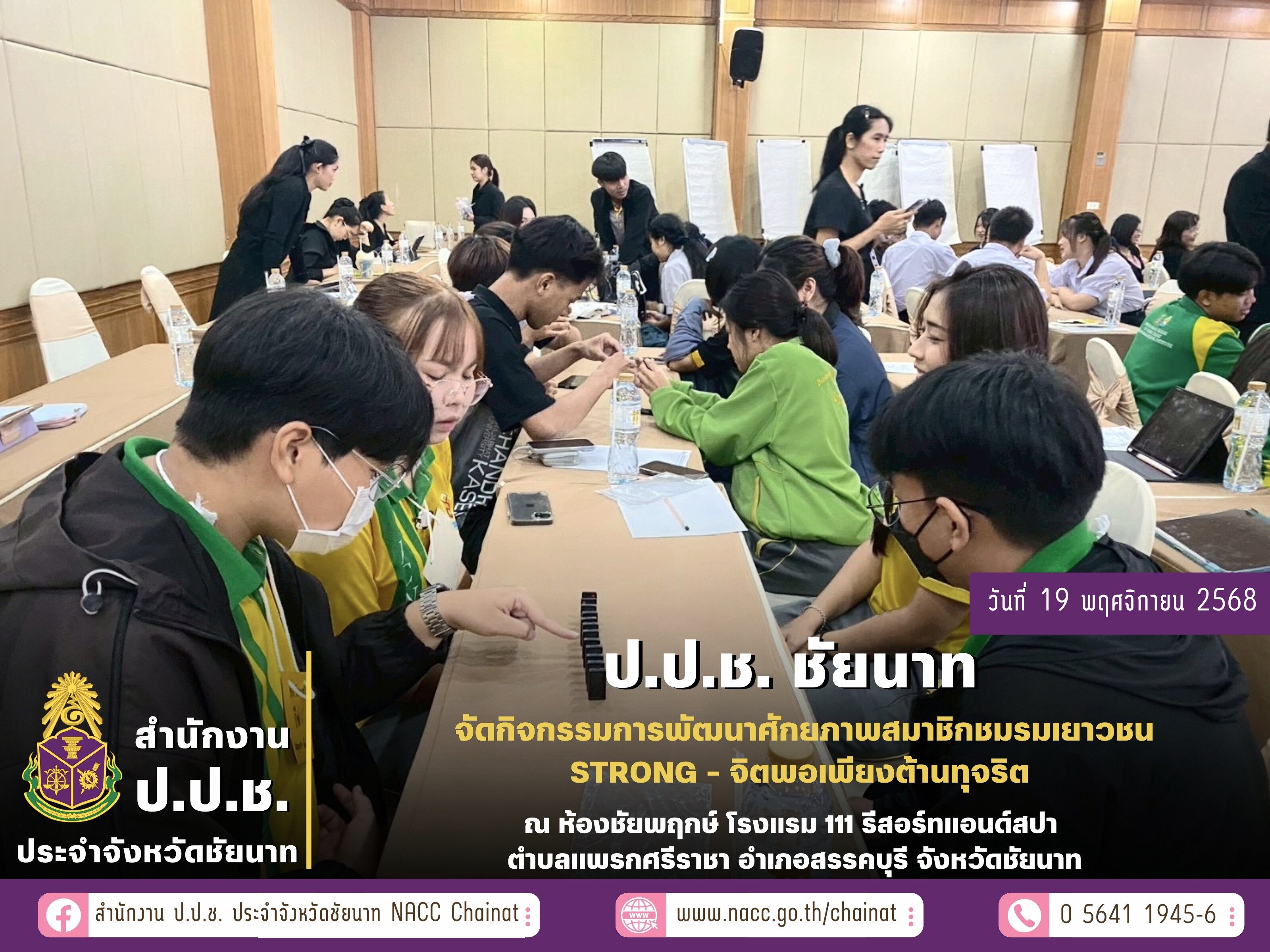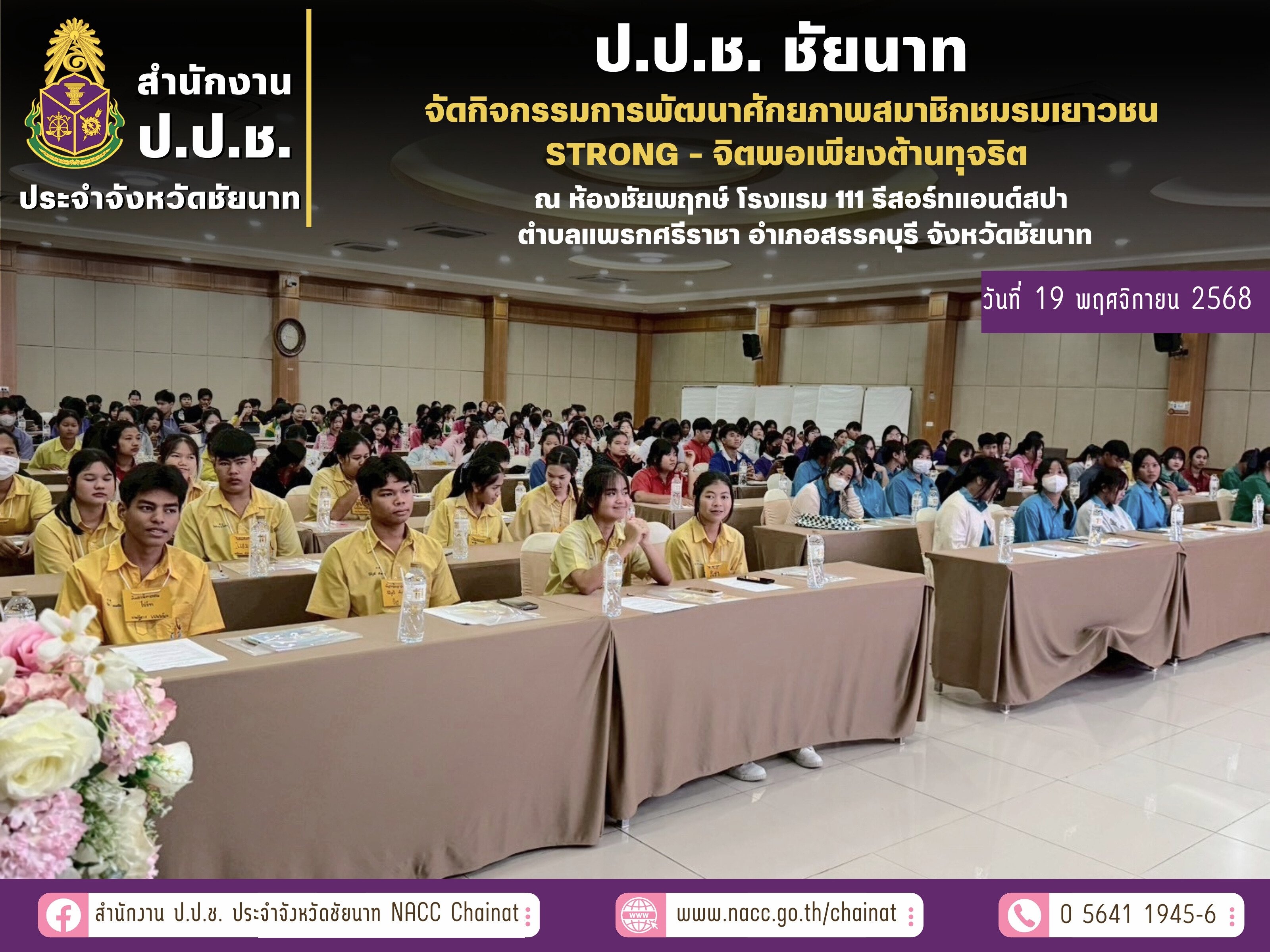 เมื่อวันที่ 19 พฤศจิกายน 2568 นายคมสันต์ จันทร์รอด ผู้อำนวยการสำนักงาน ป.ป.ช. ประจำจังหวัดชัยนาท มอบหมายให้กลุ่มงานป้องกันการทุจริต จัดกิจกรรมการพัฒนาศักยภาพสมาชิกชมรมเยาวชน STRONG - จิตพอเพียงต้านทุจริต ภายใต้โครงการเสริมพลัง STRONG ประชาชนถอนหมุดพื้นที่เสี่ยงทุจริต (ESPAC) ณ ห้องชัยพฤกษ์ โรงแรม 111 รีสอร์ทแอนด์สปา ตำบลแพรกศรีราชา อำเภอสรรคบุรี จังหวัดชัยนาท โดยมีเยาวชนเข้าร่วมจำนวน 135 คน