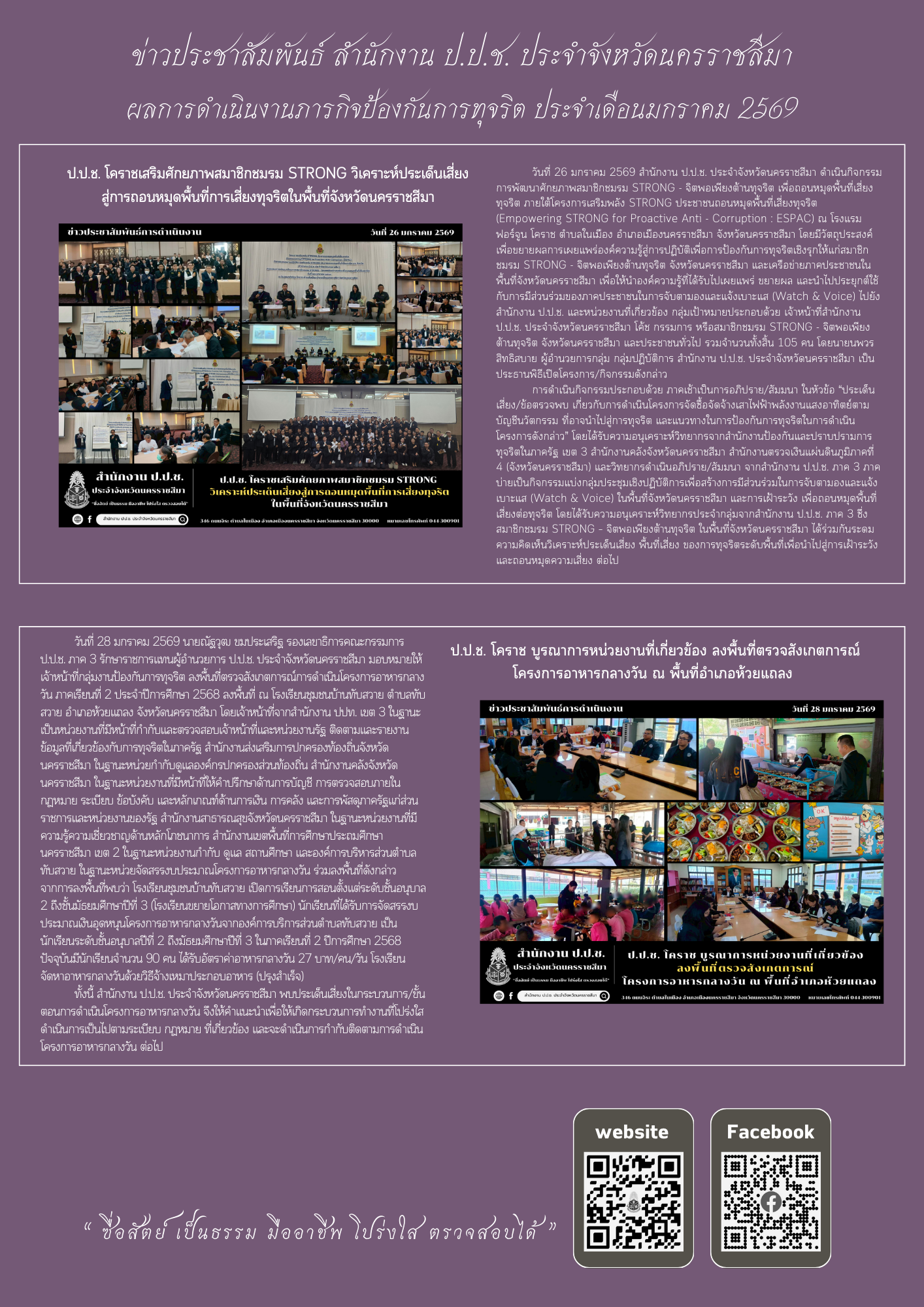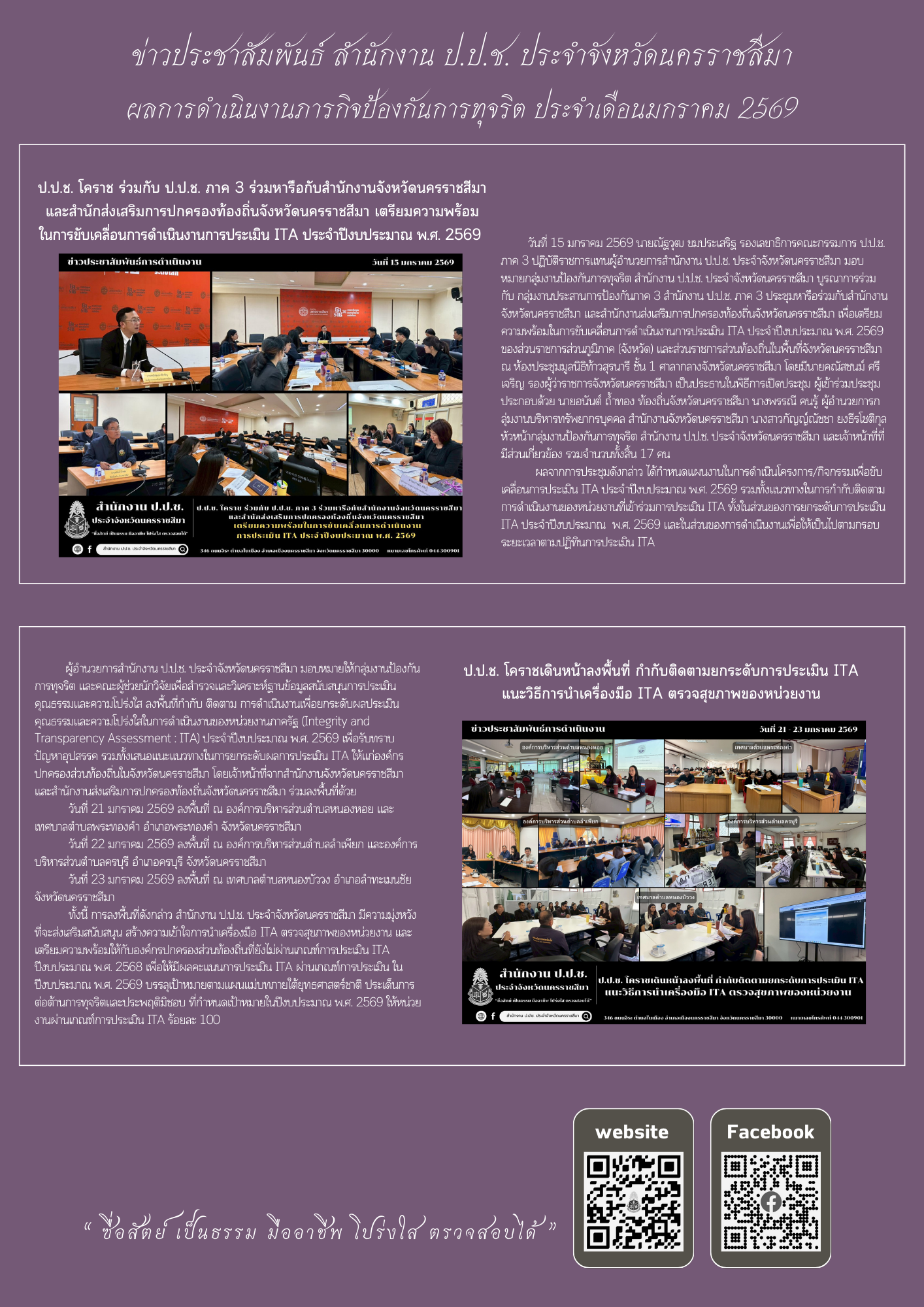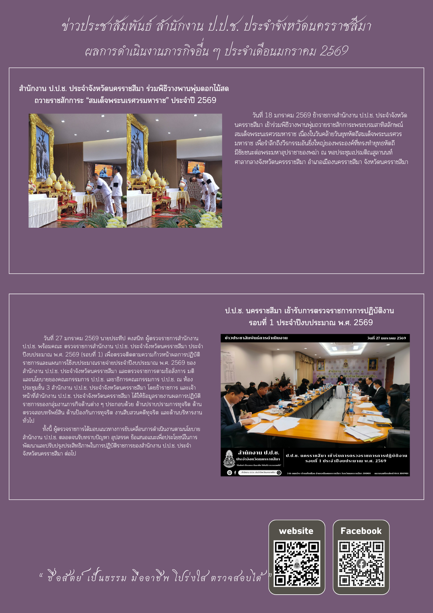 หน้าหลัก ข่าวประชาสัมพันธ์ 📢 ข่าวประชาสัมพันธ์ผลการดำเนินงานของสำนักงาน ป.ป.ช. ประจำจัง... 📢 ข่าวประชาสัมพันธ์ผลการดำเนินงานของสำนักงาน ป.ป.ช. ประจำจังหวัดนครราชสีมา ประจำเดือนมกราคม พ.ศ. 2569 จากไชต์: สำนักงาน ป.ป.ช. ประจำจังหวัดนครราชสีมา จำนวนผู้เข้าชม: 226 03/02/2569 Related 01/04/2569 📢 ข่าวประชาสัมพันธ์ผลการดำเนินงานของสำนักงาน ป.ป.ช. ประจำจังหวัดนครราชสีมา ประจำเดือนมีนาคม พ.ศ. 256... 31/03/2569 ป.ป.ช. โคราชลงพื้นที่ กำกับติดตามยกระดับการประเมิน ITA แนะวิธีการนำเครื่องมือ ITA ตรวจสุขภาพของหน่วย... 31/03/2569 สำนักงาน ป.ป.ช. ประจำจังหวัดนครราชสีมา ร่วมพิธีวางพานพุ่มดอกไม้สด “วันที่ระลึกพระบาทสมเด็จพระนั่งเกล... 30/03/2569 ป.ป.ช. โคราช สนับสนุนความรู้ยกระดับคะแนนการประเมินคุณธรรมและความโปร่งใสในการดำเนินงาน (ITA) ของหน่วย... 30/03/2569 สำนักงาน ป.ป.ช. ประจำจังหวัดนครราชสีมา ร่วมพิธีสวดพระพุทธมนต์และเจริญจิตตภาวนาอุทิศถวายแด่สมเด็จพระน... 25/03/2569 ป.ป.ช. โคราช เผยแพร่คดีที่คณะกรรมการ ป.ป.ช. มีมติ กรณีเจ้าหน้าที่รัฐและผู้ที่เกี่ยวข้องกระทำความผิดฐ... 24/03/2569 ป.ป.ช. โคราช ลงพื้นที่เฝ้าระวังโครงการปรับปรุงซ่อมแซมถนน คสล. ถนนเทศบาล ซอย 15 (สะพานวัดตลาดแค ถึงบ้... 23/03/2569 ป.ป.ช. โคราช จัดประชุมรับฟังความคิดเห็นการจัดทำร่างกฎหมายตามมาตรา 130 แห่งพระราชบัญญัติประกอบรัฐธรรม... 20/03/2569 ป.ป.ช. โคราช ลงพื้นที่เฝ้าระวังโครงการก่อสร้างถนนคอนกรีตเสริมเหล็กสามแยกบ้านนางประชวน โกฎค้างพลู เชื... 20/03/2569 ป.ป.ช. โคราช สนับสนุนให้ความรู้ปลูกจิตสำนึกคุณธรรมจริยธรรมต้านทุจริต แก่บุคลากรเทศบาลตำบลห้วยแถลง