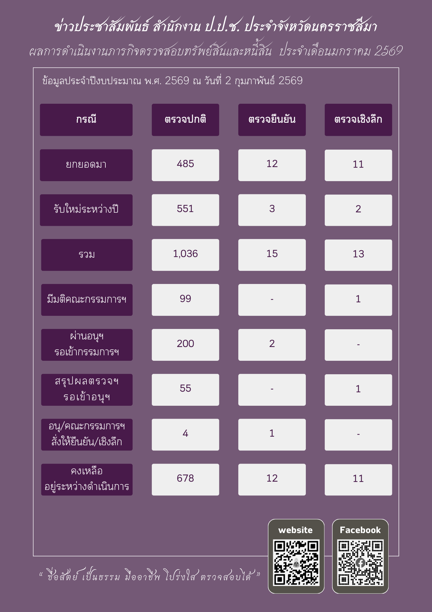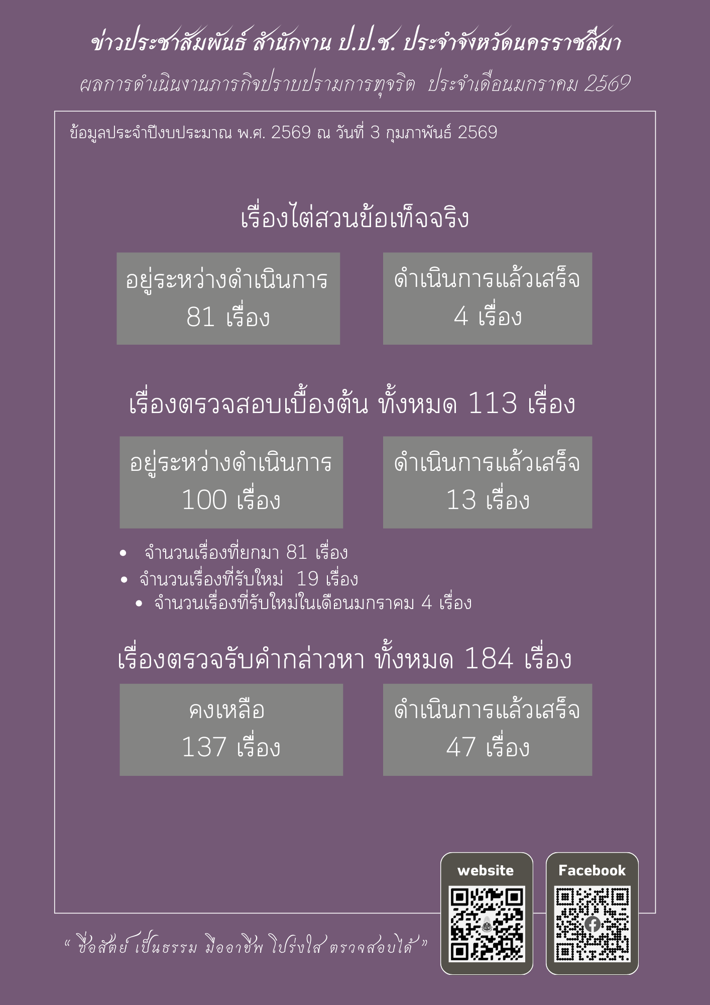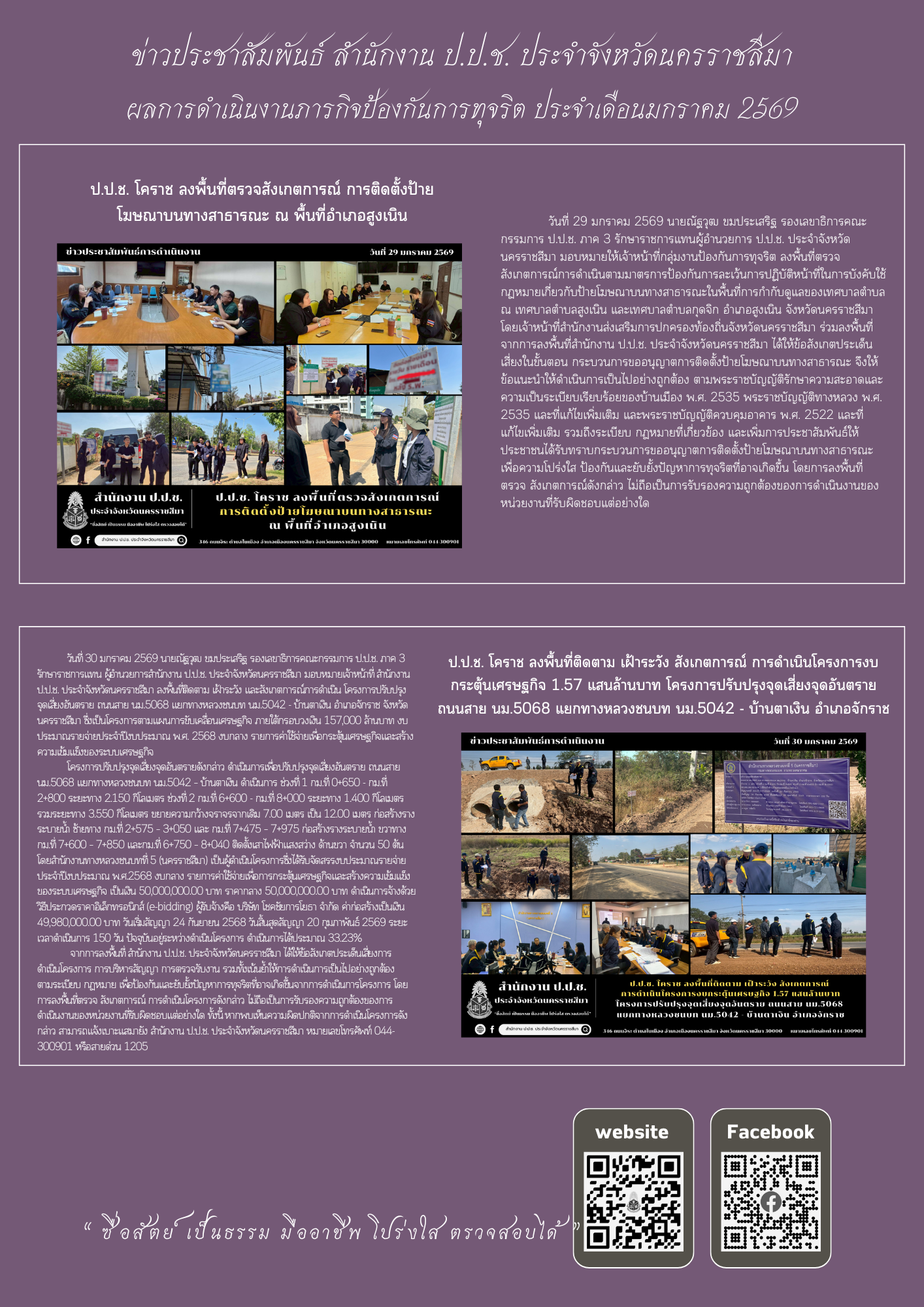 หน้าหลัก ข่าวประชาสัมพันธ์ 📢 ข่าวประชาสัมพันธ์ผลการดำเนินงานของสำนักงาน ป.ป.ช. ประจำจัง... 📢 ข่าวประชาสัมพันธ์ผลการดำเนินงานของสำนักงาน ป.ป.ช. ประจำจังหวัดนครราชสีมา ประจำเดือนมกราคม พ.ศ. 2569 จากไชต์: สำนักงาน ป.ป.ช. ประจำจังหวัดนครราชสีมา จำนวนผู้เข้าชม: 226 03/02/2569 Related 01/04/2569 📢 ข่าวประชาสัมพันธ์ผลการดำเนินงานของสำนักงาน ป.ป.ช. ประจำจังหวัดนครราชสีมา ประจำเดือนมีนาคม พ.ศ. 256... 31/03/2569 ป.ป.ช. โคราชลงพื้นที่ กำกับติดตามยกระดับการประเมิน ITA แนะวิธีการนำเครื่องมือ ITA ตรวจสุขภาพของหน่วย... 31/03/2569 สำนักงาน ป.ป.ช. ประจำจังหวัดนครราชสีมา ร่วมพิธีวางพานพุ่มดอกไม้สด “วันที่ระลึกพระบาทสมเด็จพระนั่งเกล... 30/03/2569 ป.ป.ช. โคราช สนับสนุนความรู้ยกระดับคะแนนการประเมินคุณธรรมและความโปร่งใสในการดำเนินงาน (ITA) ของหน่วย... 30/03/2569 สำนักงาน ป.ป.ช. ประจำจังหวัดนครราชสีมา ร่วมพิธีสวดพระพุทธมนต์และเจริญจิตตภาวนาอุทิศถวายแด่สมเด็จพระน... 25/03/2569 ป.ป.ช. โคราช เผยแพร่คดีที่คณะกรรมการ ป.ป.ช. มีมติ กรณีเจ้าหน้าที่รัฐและผู้ที่เกี่ยวข้องกระทำความผิดฐ... 24/03/2569 ป.ป.ช. โคราช ลงพื้นที่เฝ้าระวังโครงการปรับปรุงซ่อมแซมถนน คสล. ถนนเทศบาล ซอย 15 (สะพานวัดตลาดแค ถึงบ้... 23/03/2569 ป.ป.ช. โคราช จัดประชุมรับฟังความคิดเห็นการจัดทำร่างกฎหมายตามมาตรา 130 แห่งพระราชบัญญัติประกอบรัฐธรรม... 20/03/2569 ป.ป.ช. โคราช ลงพื้นที่เฝ้าระวังโครงการก่อสร้างถนนคอนกรีตเสริมเหล็กสามแยกบ้านนางประชวน โกฎค้างพลู เชื... 20/03/2569 ป.ป.ช. โคราช สนับสนุนให้ความรู้ปลูกจิตสำนึกคุณธรรมจริยธรรมต้านทุจริต แก่บุคลากรเทศบาลตำบลห้วยแถลง