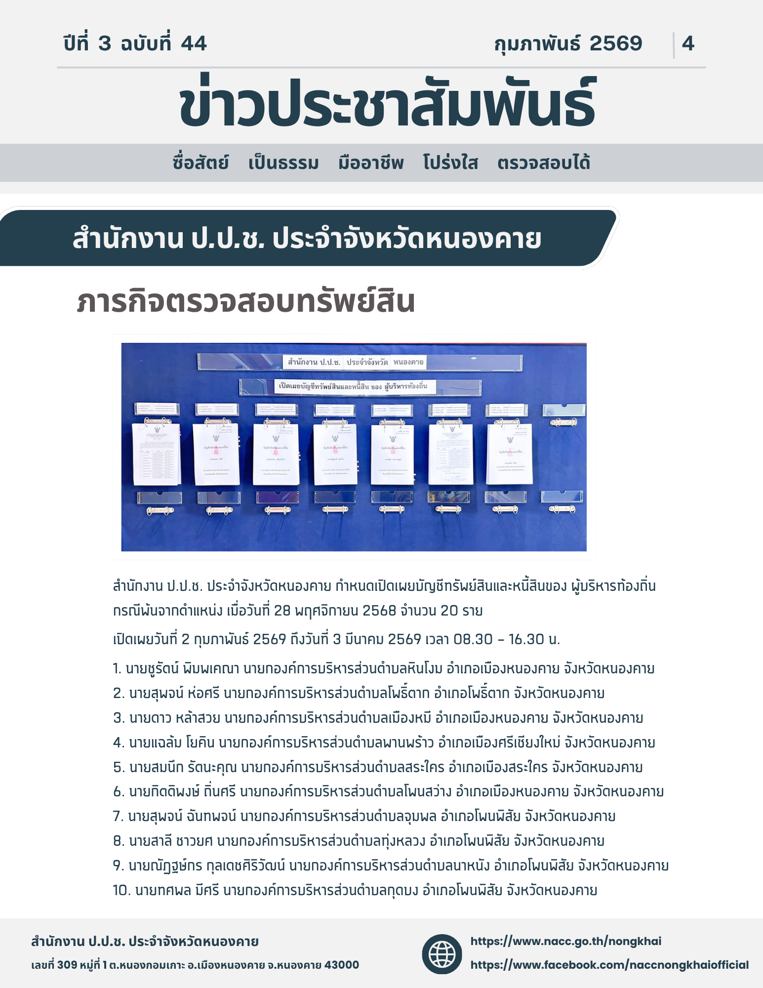 🟪 สำนักงาน ป.ป.ช. ประจำจังหวัดหนองคาย กำหนดเปิดเผยบัญชีทรัพย์สินและหนี้สินของ ผู้บริหารท้องถิ่น จำนวน 20 ราย 🔴 Click >> https://asset.nacc.go.th/dcs-app/ ............................................... 📌สำนักงาน ป.ป.ช. ประจำจังหวัดหน...