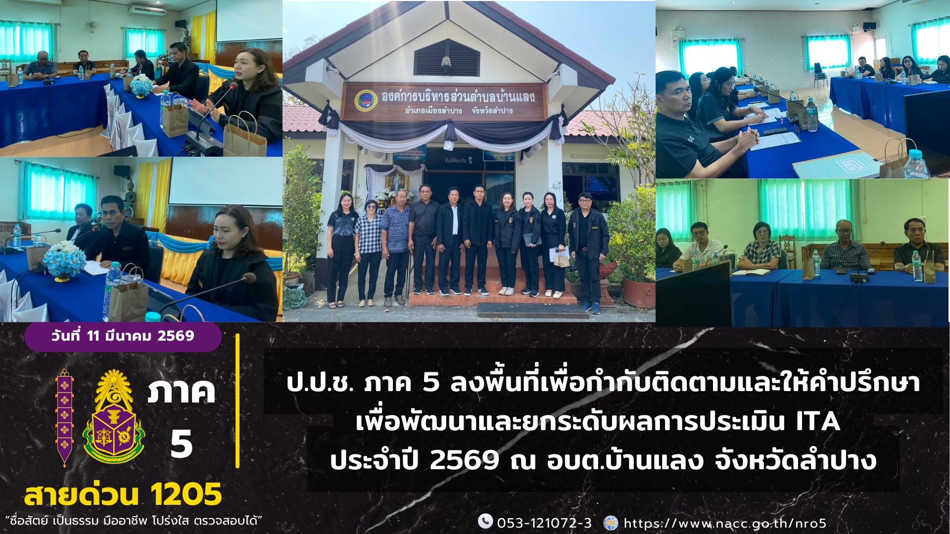 เมื่อวันที่ 11 มีนาคม 2569 กลุ่มประสานการป้องกันการทุจริตภาค 5 ลงพื้นที่กำกับ ติดตาม และให้คำปรึกษาในการเตรียมความพร้อมเพื่อพัฒนาและยกระดับผลการประเมินคุณธรรมและความโปร่งใสในการดำเนินงานของหน่วยงานภาครัฐ (ITA) ประจำปีงบประมาณ พ.ศ. 2569 ณ อบต.บ้านแลง อำเภอเมืองลำปาง จังหวัดลำปาง