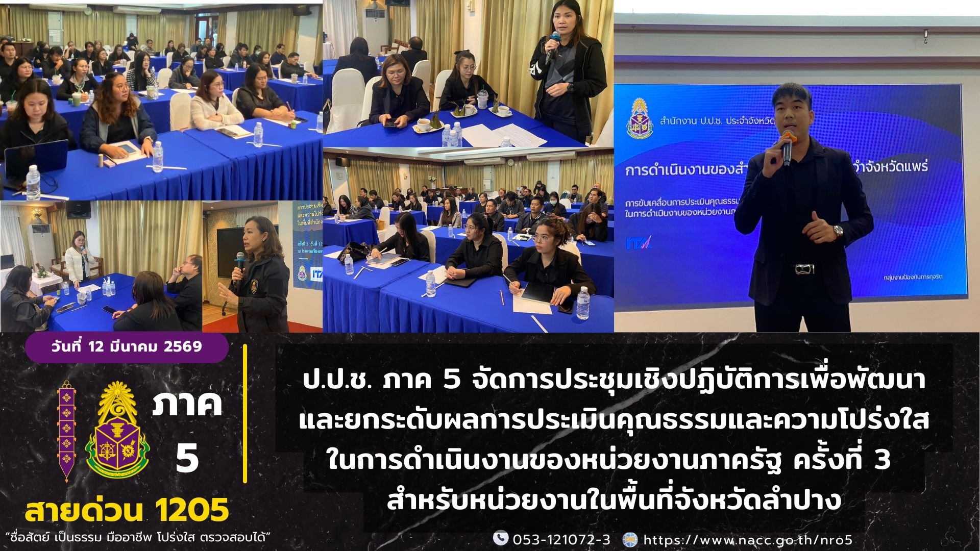 วันที่ 12 มีนาคม 2569 สำนักงาน ป.ป.ช. ภาค 5 จัดการประชุมเชิงปฏิบัติการเพื่อพัฒนาและยกระดับผลการประเมินคุณธรรมและความโปร่งใสในการดำเนินงานของหน่วยงานภาครัฐ (Integrity and Transparency Assessment: ITA) ครั้งที่ 3 สำหรับหน่วยงานในพื้นที่จังหวัดลำปาง ณ โรงแรมเวียงลคอร อำเภอเมืองลำปาง จังหวัดลำปาง