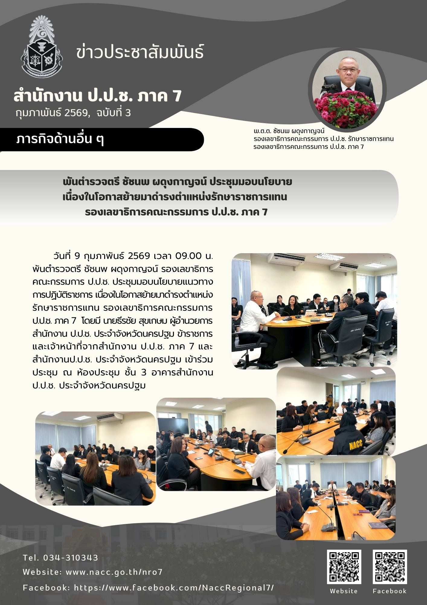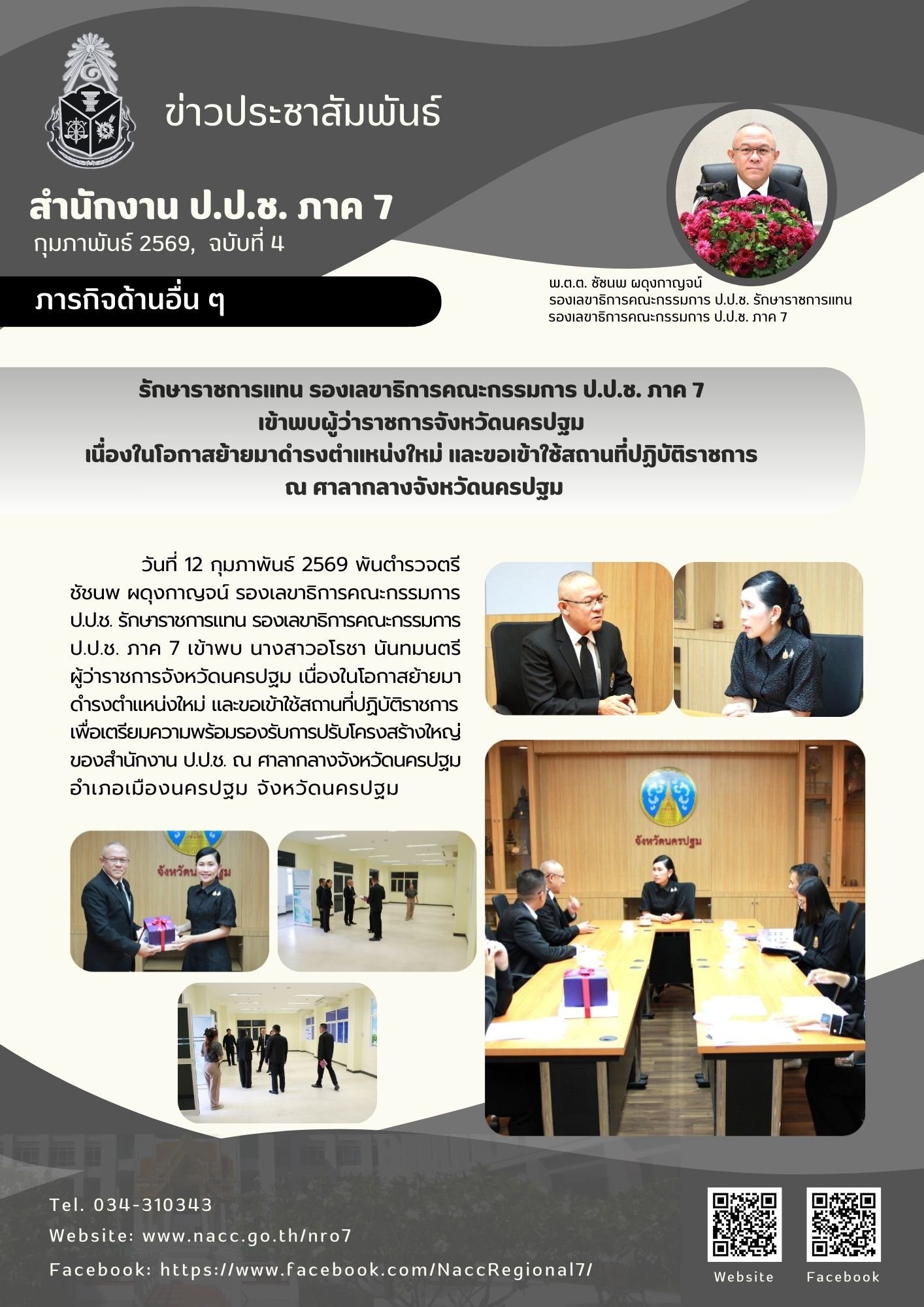 วันที่ 12 กุมภาพันธ์ 2569 พันตำรวจตรี ชัชนพ ผดุงกาญจน์ รองเลขาธิการคณะกรรมการ ป.ป.ช. รักษาราชการแทน รองเลขาธิการคณะกรรมการ ป.ป.ช. ภาค 7 เข้าพบ นางสาวอโรชา นันทมนตรี ผู้ว่าราชการจังหวัดนครปฐม เนื่องในโอกาสย้ายมาดำรงตำ...