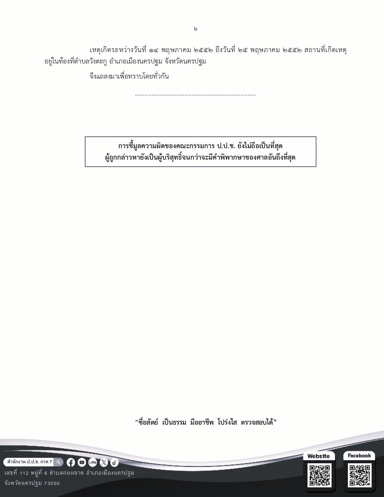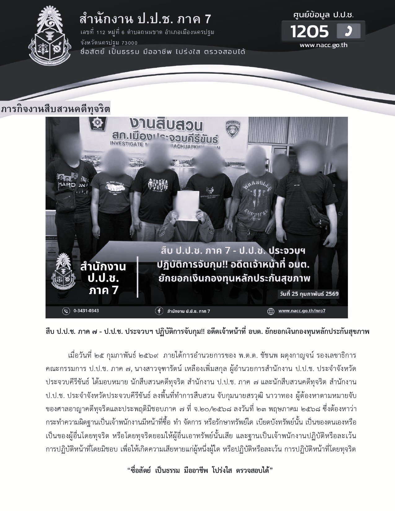 เมื่อวันที่ ๒๕ กุมภาพันธ์ ๒๕๖๙ ภายใต้การอำนวยการของ พ.ต.ต. ชัชนพ ผดุงกาญจน์ รองเลขาธิการคณะกรรมการ ป.ป.ช. ภาค ๗, นางสาวจุฑารัตน์ เหลืองเพิ่มสกุล ผู้อำนวยการสำนักงาน ป.ป.ช. ประจำจังหวัดประจวบคีรีขันธ์ ได้มอบหมาย นักสืบสวนคดีทุจริต สำนักงาน ป.ป.ช...