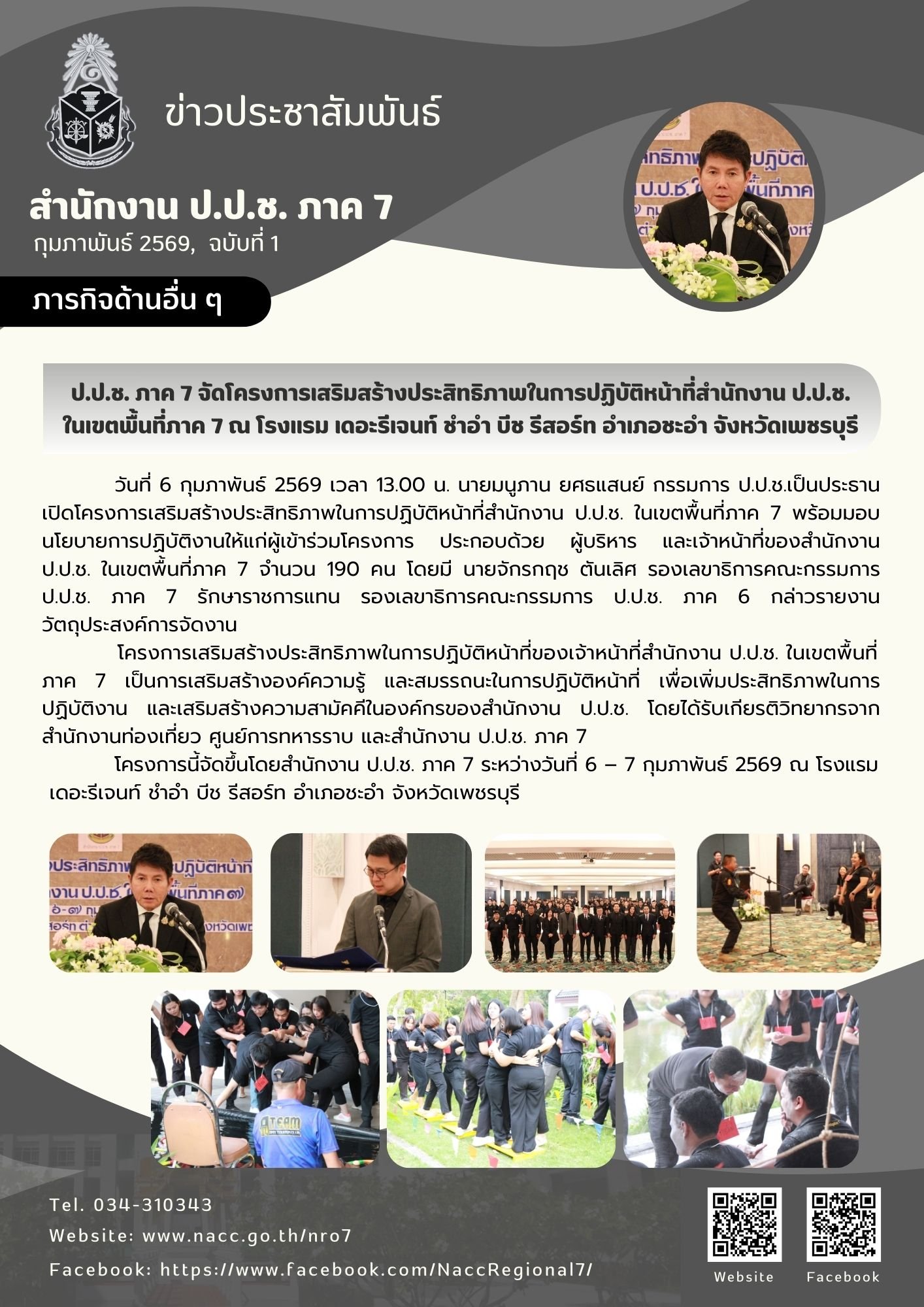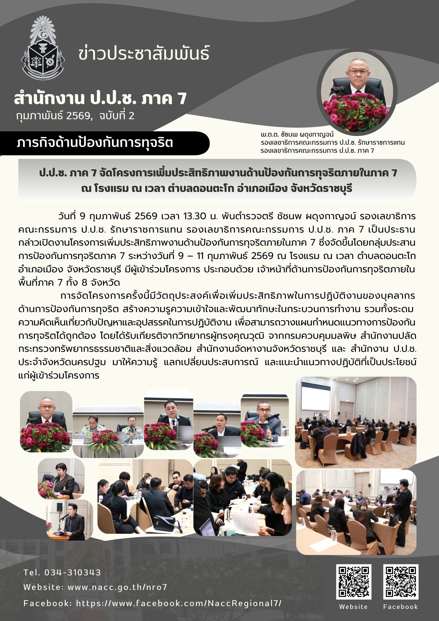 วันที่ 9 กุมภาพันธ์ 2569 เวลา 13.30 น. พันตำรวจตรี ชัชนพ ผดุงกาญจน์ รองเลขาธิการคณะกรรมการ ป.ป.ช. รักษาราชการแทน รองเลขาธิการคณะกรรมการ ป.ป.ช. ภาค 7 เป็นประธานกล่าวเปิดงานโครงการเพิ่มประสิทธิภาพงานด้านป้องกันการทุจริตภายในภาค 7 ซึ่งจัดขึ้นโดยกลุ่มประ...