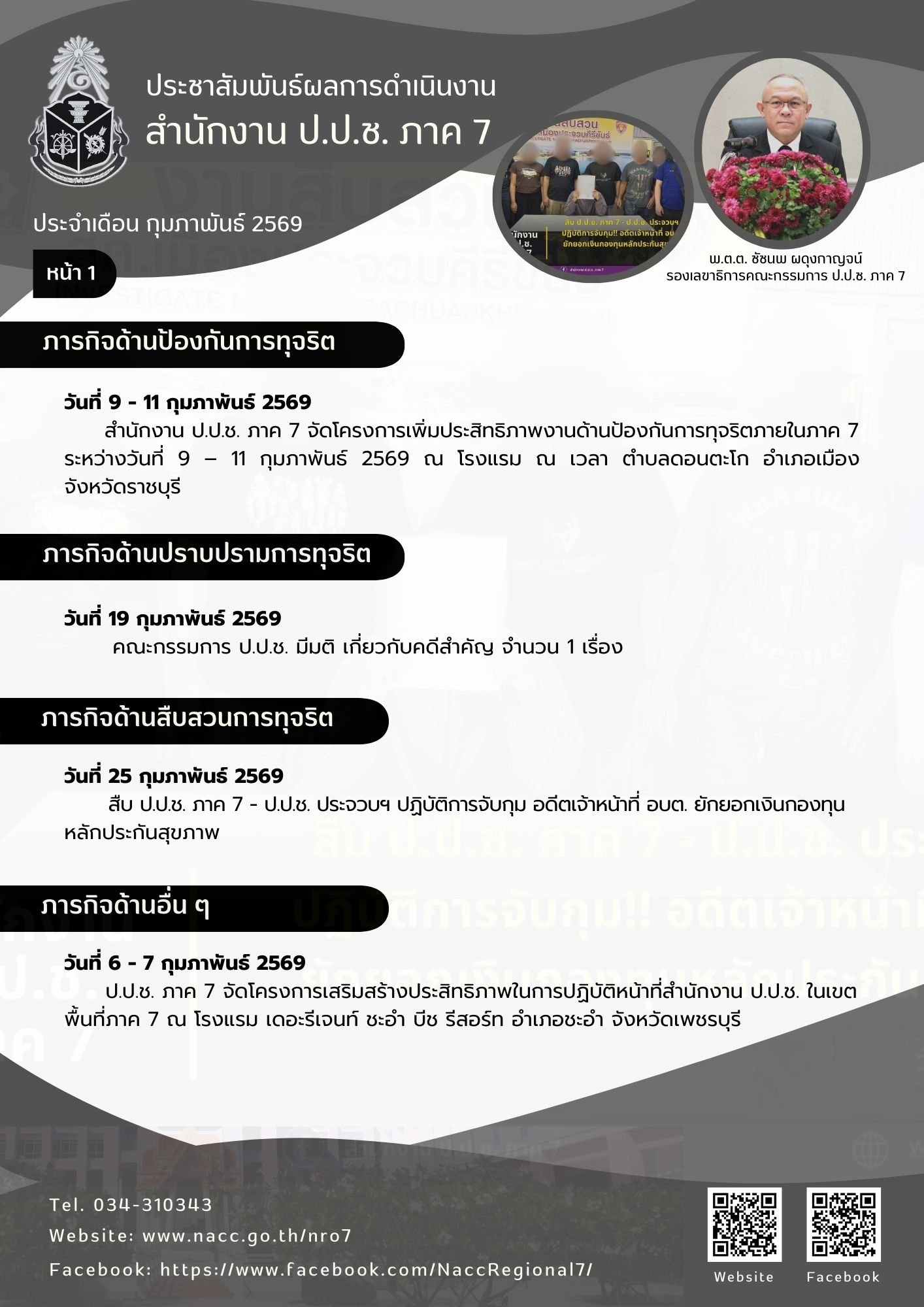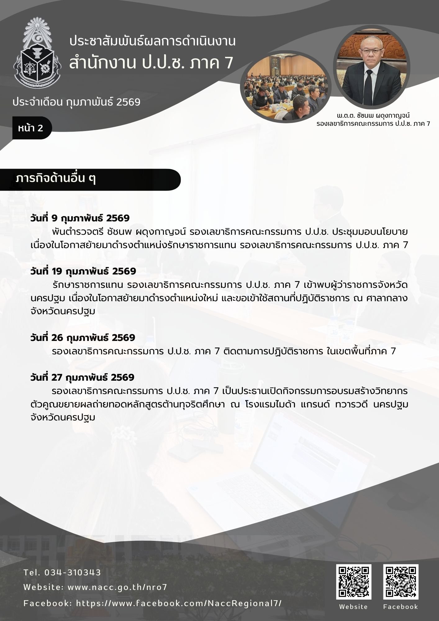 ระหว่างวันที่ 23 - 24 กุมภาพันธ์ 2569 พันตำรวจตรี ชัชนพ ผดุงกาญจน์ รองเลขาธิการคณะกรรมการ ป.ป.ช. ภาค 7 เข้าตรวจเยี่ยม สำนักงาน ป.ป.ช. ประจำจังหวัดในพื้นที่ภาค 7 เพื่อมอบนโยบาย ติดตามการปฏิบัติราชการ และให้กำลังใจแก่เจ้าหน้าที่ พร้อมทั้งรับทราบปัญหาอุ...