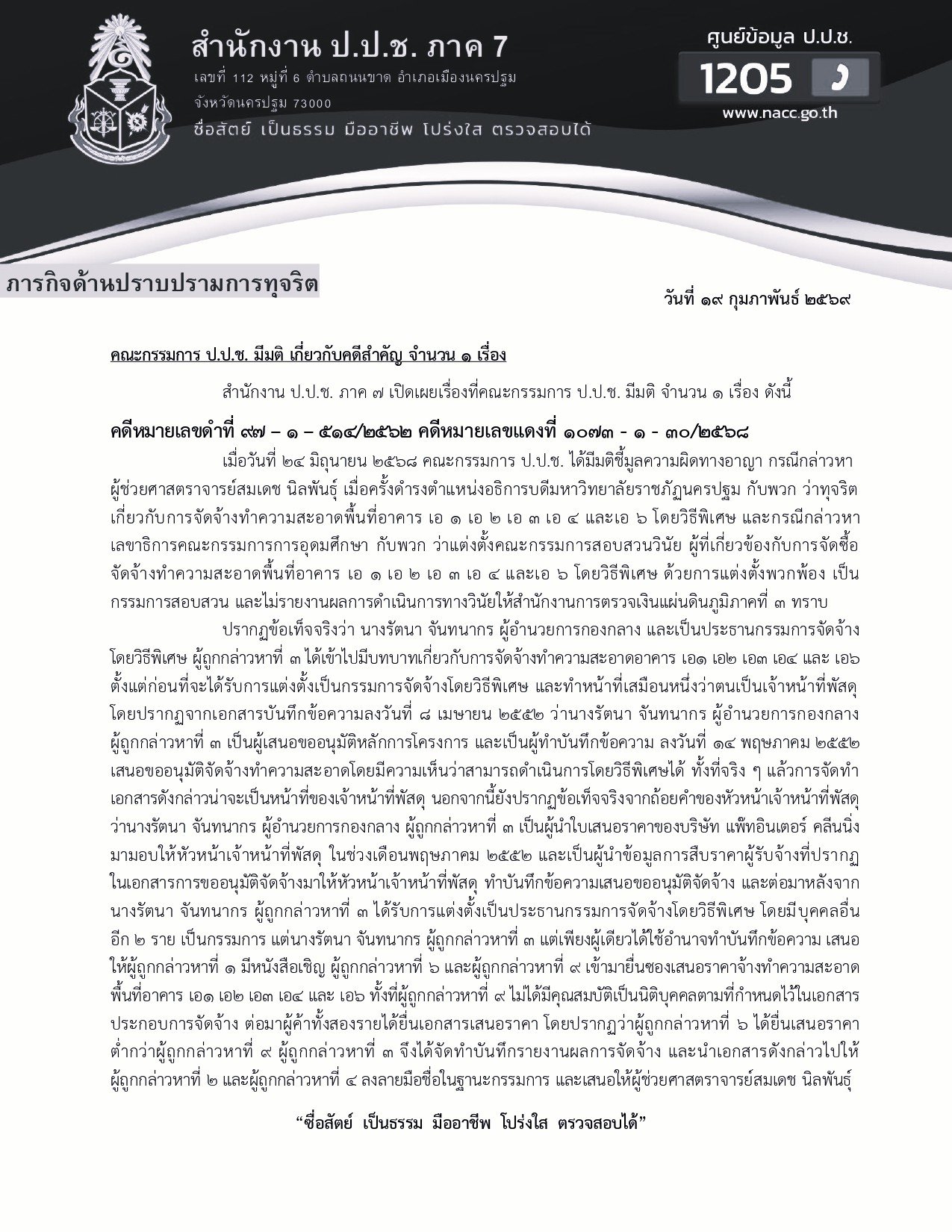 คณะกรรมการ ป.ป.ช. มีมติ เกี่ยวกับคดีสำคัญ จำนวน ๑ เรื่อง สำนักงาน ป.ป.ช. ภาค ๗ เปิดเผยเรื่องที่คณะกรรมการ ป.ป.ช. มีมติ จำนวน ๑ เรื่อง ดังนี้ คดีหมายเลขดำที่ ๙๗ – ๑ – ๕๑๔/๒๕๖๒ คดีหมายเลขแดงที่ ๑๐๗๓ - ๑ - ๓๐/๒๕๖๘ ...