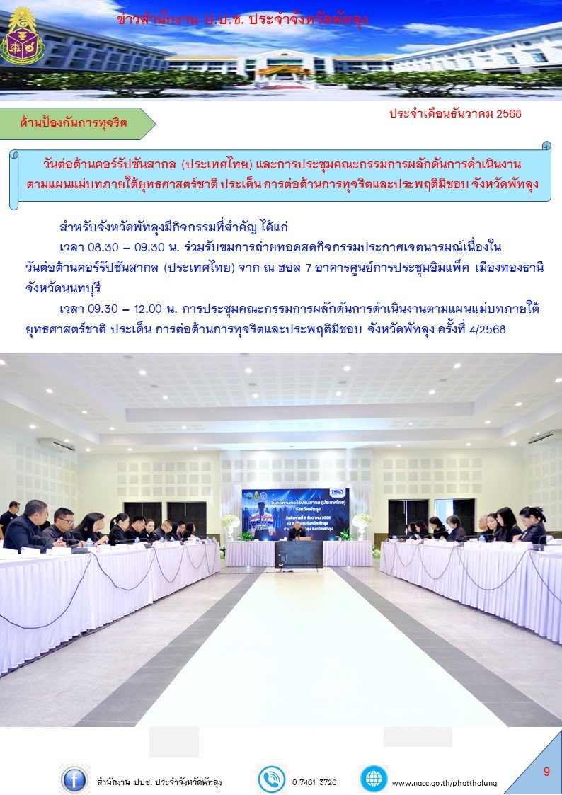 หน้าหลัก ข่าวประชาสัมพันธ์ ผลการดำเนินงานของสำนักงาน ป.ป.ช. ประจำจังหวัดพัทลุง ประจำเดื... ผลการดำเนินงานของสำนักงาน ป.ป.ช. ประจำจังหวัดพัทลุง ประจำเดือนธันวาคม 2568 จากไชต์: สำนักงาน ป.ป.ช. ประจำจังหวัดพัทลุง จำนวนผู้เข้าชม: 732 30/12/2568 Related 30/03/2569 ผลการดำเนินงานของสำนักงาน ป.ป.ช. ประจำจังหวัดพัทลุง ประจำเดือนมีนาคม 2569 09/03/2569 ประกาศสำนักงาน ป.ป.ช. ประจำจังหวัดพัทลุง เรื่องสรุปผลการดำเนินการจัดซื้อจัดจ้างหรือการจัดหาพัสดุประจ... 27/02/2569 ผลการดำเนินงานของสำนักงาน ป.ป.ช. ประจำจังหวัดพัทลุง ประจำเดือนกุมภาพันธ์ 2569 09/02/2569 ประกาศสำนักงาน ป.ป.ช. ประจำจังหวัดพัทลุง เรื่องสรุปผลการดำเนินการจัดซื้อจัดจ้างหรือการจัดหาพัสดุประจ... 02/02/2569 ผลการดำเนินงานของสำนักงาน ป.ป.ช. ประจำจังหวัดพัทลุง ประจำเดือนมกราคม 2569 22/01/2569 ประกาศสำนักงาน ป.ป.ช. ประจำจังหวัดพัทลุง เรื่อง สรุปผลการดำเนินการจัดซื้อจัดจ้างประจำ เดือนตุลาคม ถึ... 22/01/2569 ประกาศสำนักงาน ป.ป.ช. ประจำจังหวัดพัทลุง เรื่อง ประกาศผลผู้ชนะการจัดซื้อจัดจ้างหรือผู้ได้รับการคัดเล... 22/01/2569 ประกาศสำนักงาน ป.ป.ช. ประจำจังหวัดพัทลุง เรื่องสรุปผลการดำเนินการจัดซื้อจัดจ้างหรือการจัดหาพัสดุประจ... 14/01/2569 มารู้จัก ITA กัน 29/12/2568 ป.ป.ช. พัทลุง ติดตามโครงการอาหารกลางวันและการใช้งบประมาณ เมื่อวันที่ 26 ธันวาคม 2568 นางสาวต้องจิตร ธรรมคง ผู้อำนวยการสำนักงาน ป.ป.ช. ประจำจังหวัดพัทลุง มอบหมายให้เจ้าหน้าที่กลุ่มงานป้องกันการทุจริต ลงพื้นที่ขอทราบข้อเท็จจริง กรณีได้รับเบาะแสจากสื่อสังคมออนไลน์เกี่ยวกับปัญหาโครงการอาหารกลางวัน...