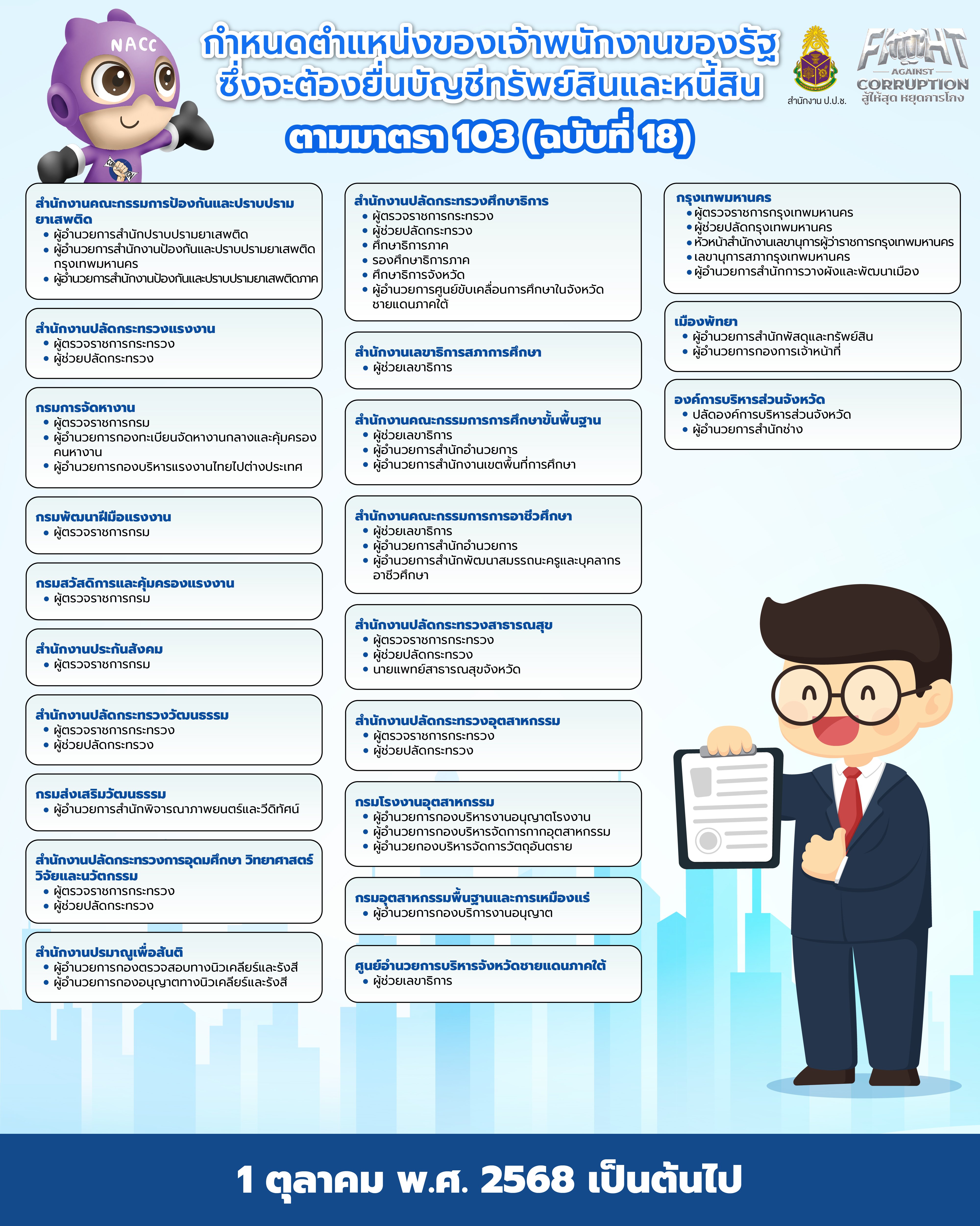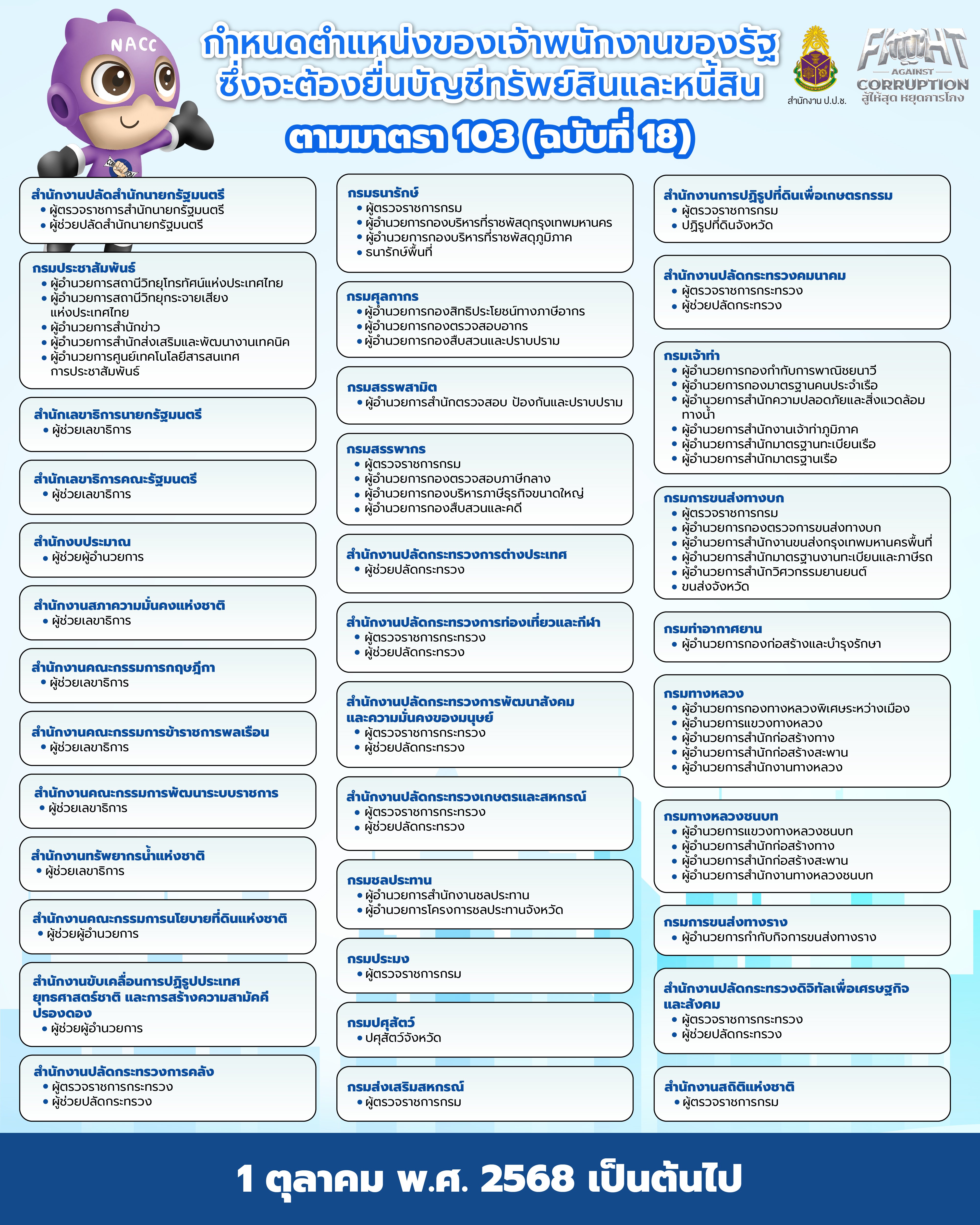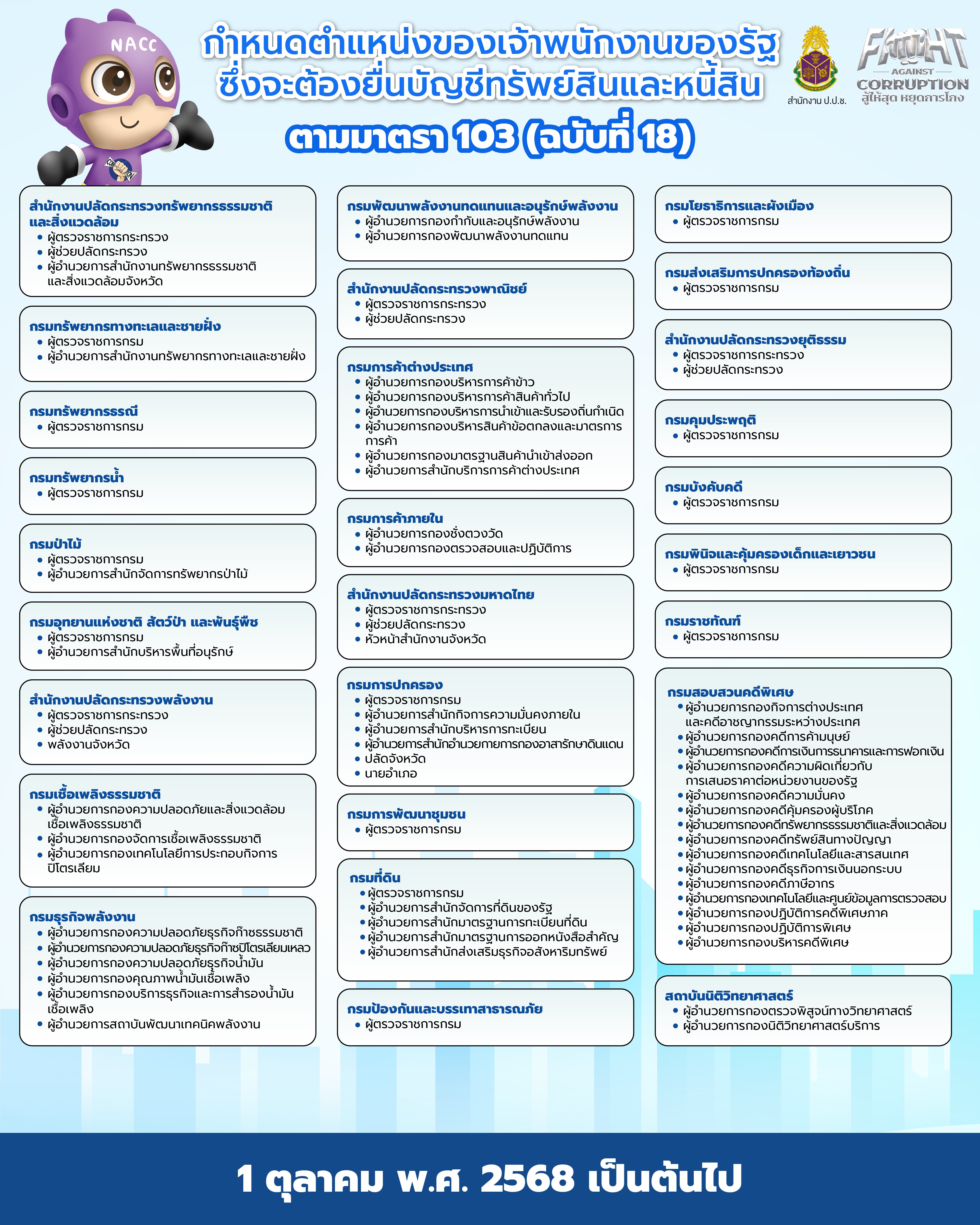 แนวทางการยื่นบัญชีทรัพย์สินและหนี้สิน ตามพระราชบัญญัติประกอบรัฐธรรมนูญว่าด้วยการป้องกันและปราบปรามการทุจริต พ.ศ. 2561 มาตรา 103 และประกาศคณะกรรมการ ป.ป.ช. 2568 เรื่อง กำหนดตำแหน่งของเจ้าพนักงานของรัฐซึ่งจะต้องยื่นบัญชีทรัพย์สินและหนี้สิน ตามมาตรา 103 (ฉบับที่ 18) พ.ศ. 2568 ที่มีผลใช้บังคับตั้งแต่ 1 ตุลาคม 2568 เพื่อสร้างการรับรู้ให้แก่หน่วยงานที่เกี่ยวข้องและประชาชนได้รับทราบ และเกิดการมีส่วนร่วมในการป้องกันการทุจริต